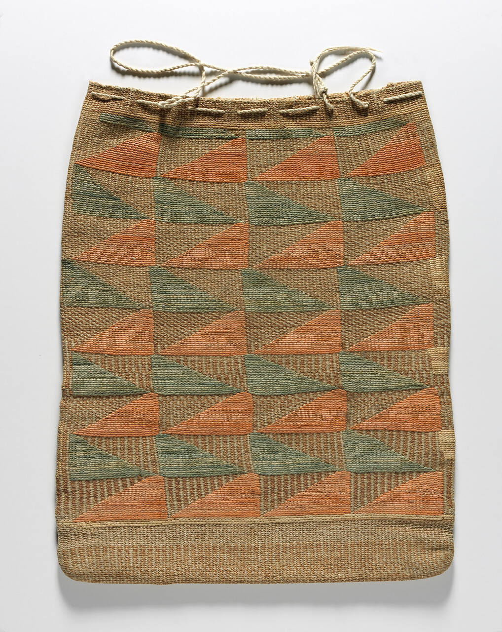 DescriptionRectangular woven flat bag ornamented on one side with a design comprised of orange and green triangles.