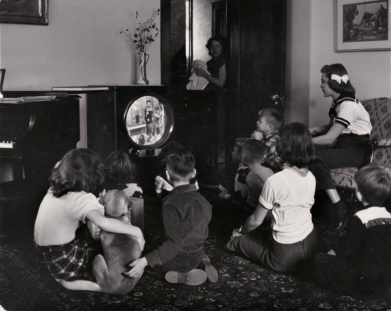 InscribedOn back in pencil: "School by T.V. In living room students from neighborhood watch hygiene program while mother of four of them looks in from kitchen. / Dental hygiene featuring 2 hand puppets / Davis Lorese." Stamp on back reads: "Used in Life, Feb. 12, 1951 p. 98."