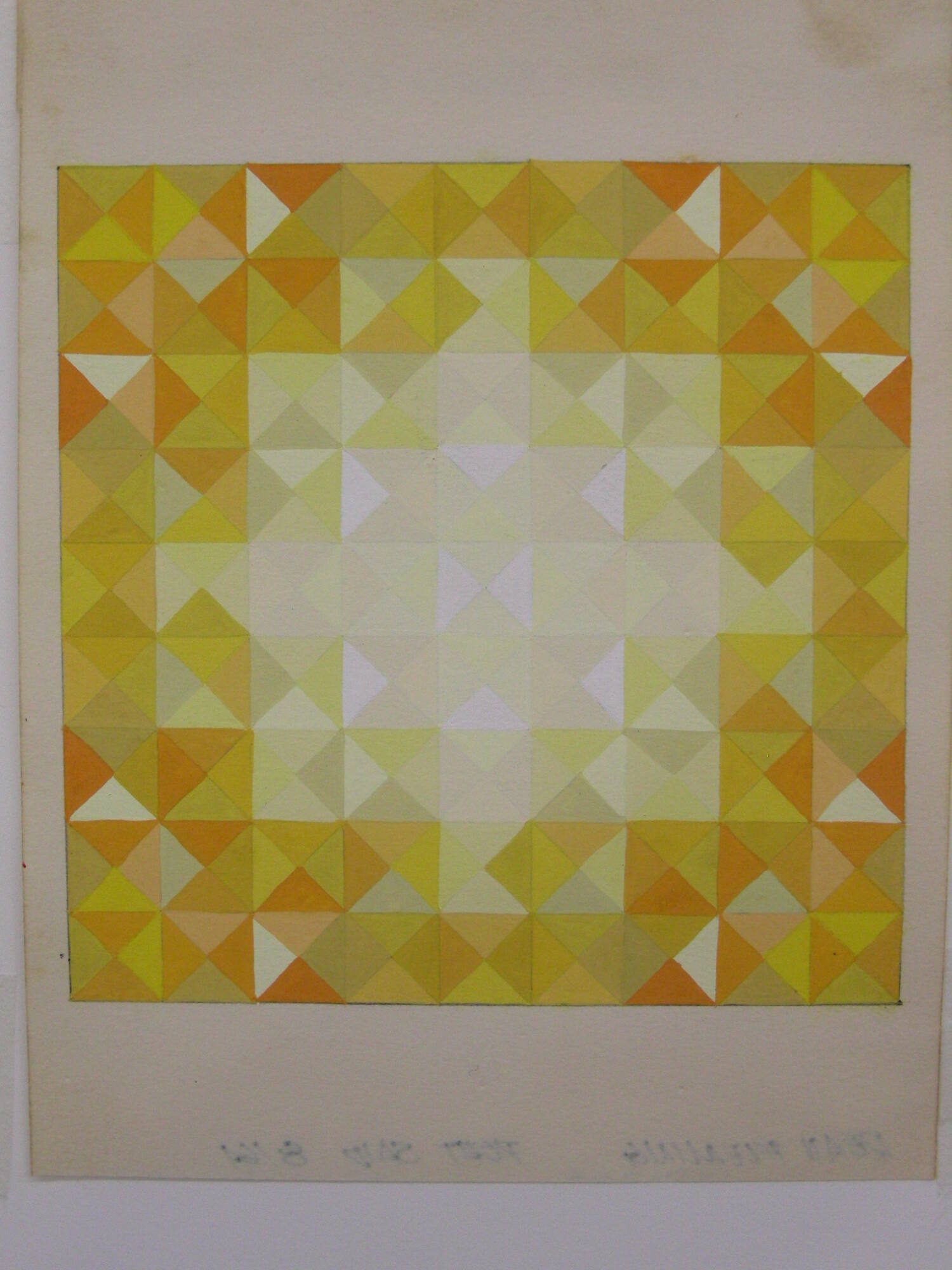 DescriptionThis is an abstract painting made up of patterns of triangles. The color palette consists of warm hues - white, cream, yellows, and oranges.Copyright© Dean Fleming