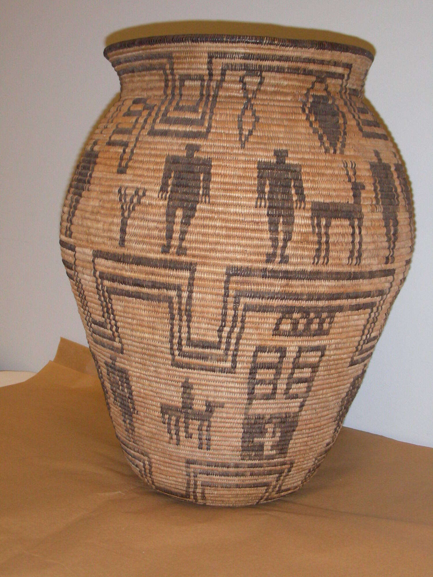 DescriptionVase shaped coil basket of light brown color with dark brown patterns in geometric and figurative forms.Gallery LabelThe Western Apache created baskets for their own use but expanded their production dramatically in response to the burgeoning tourist market at the turn of the 20th century. Known for their exceptional craftsmanship, Apache women produced finely woven baskets with distinctive designs closely related to those of the neighboring Yavapai and Havasupai. Compositions of the three groups often incorporated human figures, animals and plant forms in combination with various geometric elements. While some Apache designs were precisely organized, others were arranged in highly asymmetrical, precariously balanced configurations as seen in this basket. Here, the weaver has placed a number of mysterious figures, evocative of those found in ancient petroglyphs and rock paintings, within encompassing angular motifs that might be interpreted as elements of the desert landscape.