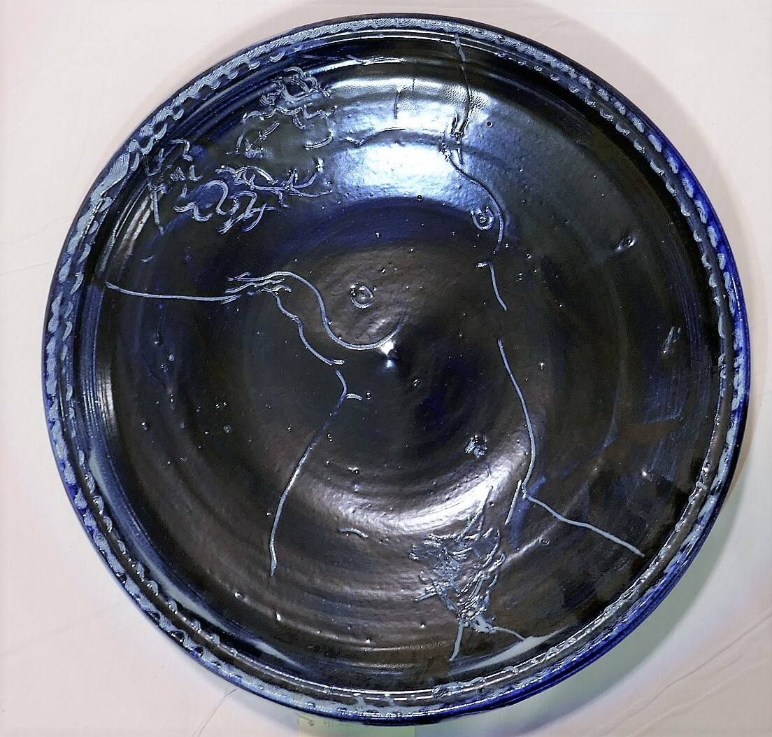 DescriptionThick, round, flaring ceramic platter with heavy lip and foot ring. Opaque blue glaze. Incised across the interior is a stylized, large, contour drawing of a nude female figure, extending out of the picture plane.Copyright© Estate of Kenneth Ferguson