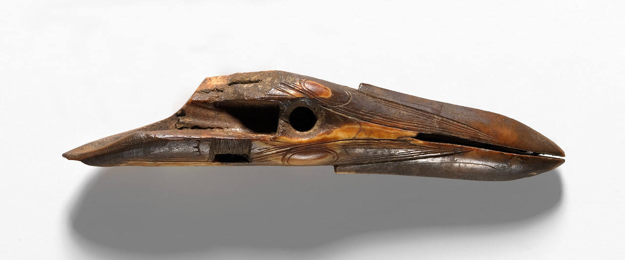 DescriptionAbstract object with a whole in its center and pointed ends, one with a slot; overall object is composed of mottled brown ivory and ornamented with an incised design of lines and circles.