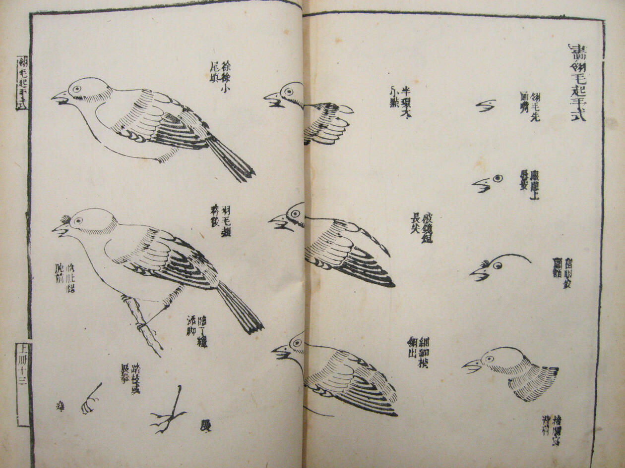DescriptionWoodblock prints on Korean paper in color and in monochrome. Volumes 1 and 2 are monochrome, flowers, insects and birds. Volumes 3 and 4 are polychrome.
