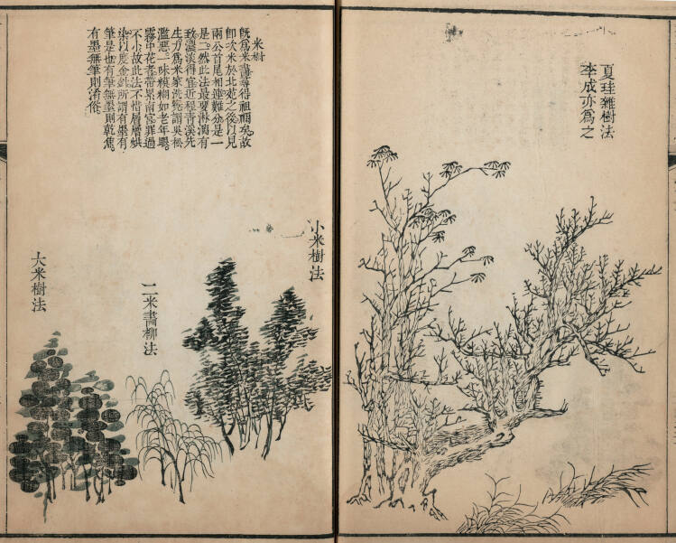DescriptionWoodblock prints on Korean paper in color and monochrome.Gallery LabelBoth printed manuals provided an affordable resource for students aspiring to learn the styles of early master painters. The Ten Bamboo Studio gives simple instructions on handling a brush to create images, such as the types of grass displayed in the second print. Published 50 years later, The Mustard Seed Garden includes many volumes dedicated to the instruction of painting. The first volume covers the use of painting tools and materials: brushes, ink and pigments. The next several volumes explain the type of images such as trees, rocks, birds, flowers and figures, through either samples by early masters or step-by-step instruction.