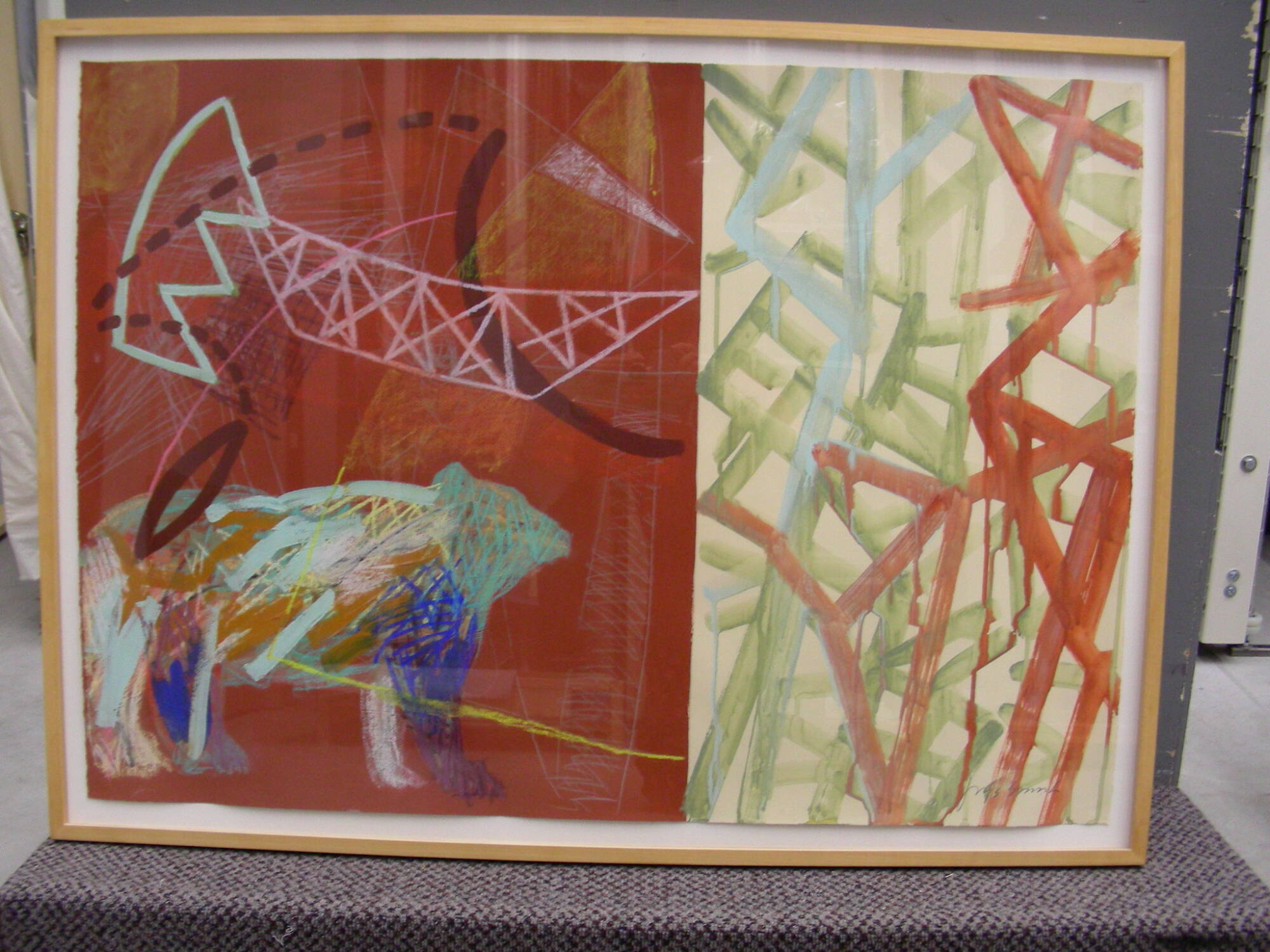 DescriptionThis work of art is divided into two sections. The right side consists of abstract angular dripping brushstrokes painted in turquoise, green and brick red. The left side contains figural elements including a bear in the lower left corner and abstract linear motifs which are in geometric configurations. The ground of the left side is brick red and the bear is made up of gestural strokes in turquoise and blue.Copyright© Flomenhaft Gallery, New York, NY
