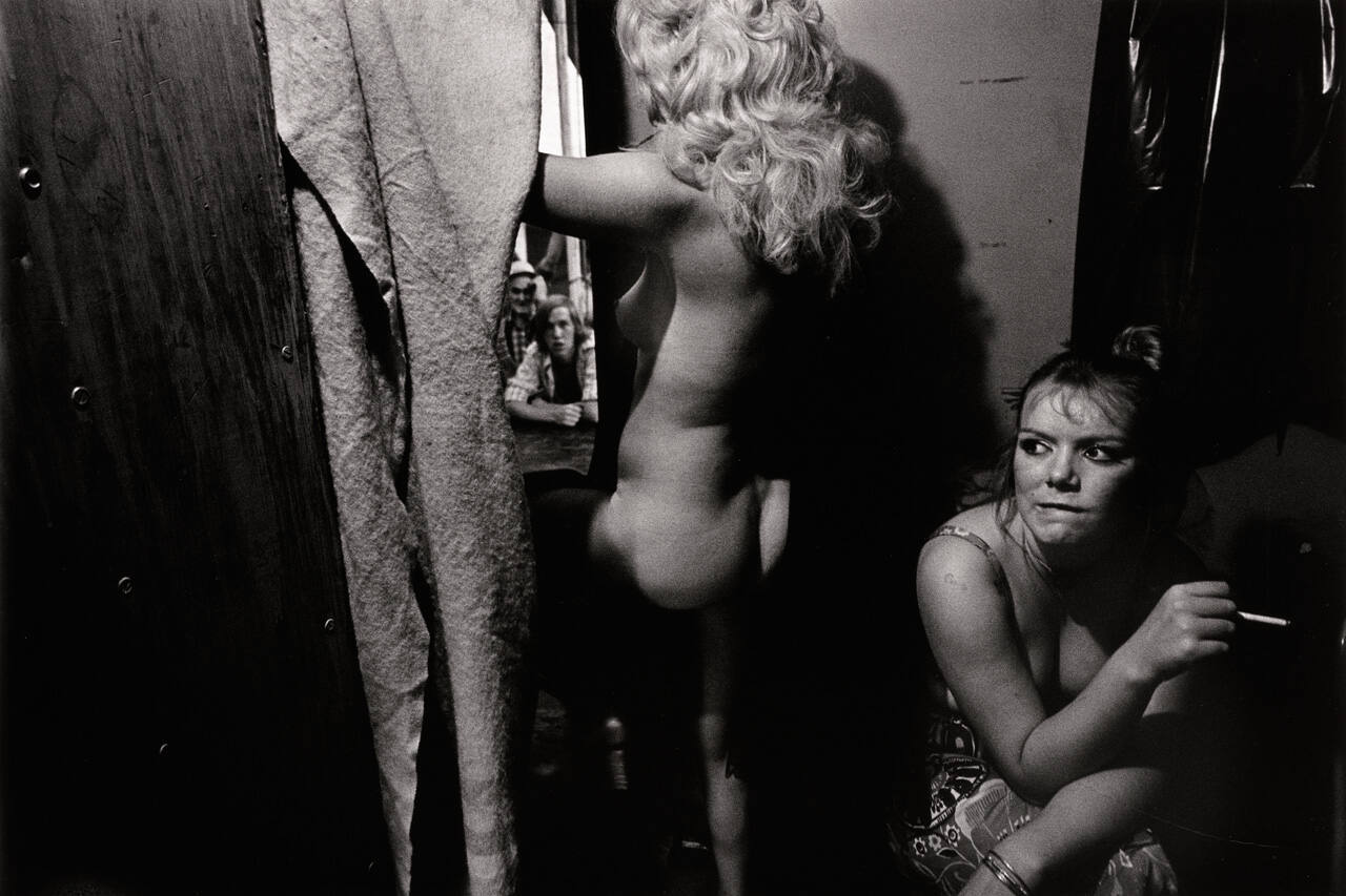 DescriptionTwo women shown backstage at carnival (one standing, naked, with back to camera, the other seated and hunched, holding a cigarette nd biting lower lip).Exhibition History