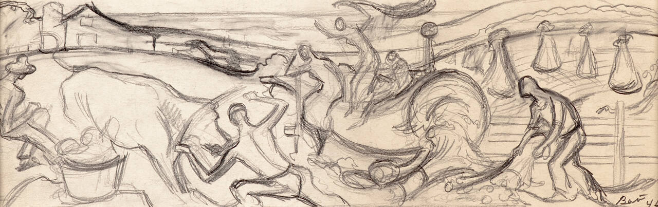 Benton created many compositional drawings for his murals. In these two examples, we get a glimpse of how the rolling arcs and triangles of the early designs turned into the figures, animals and landscape elements of the final painting.