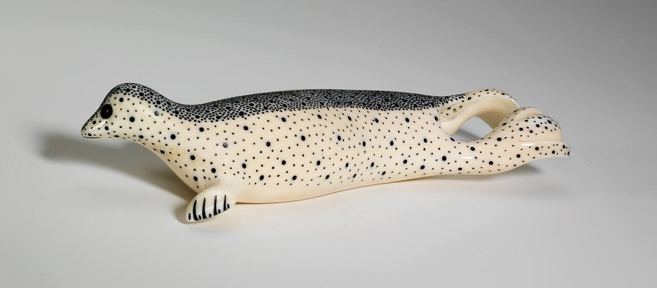 DescriptionHighly polished ivory carving of a swimming seal, white in color and covered with black spots.Copyright© Clifford Apatiki