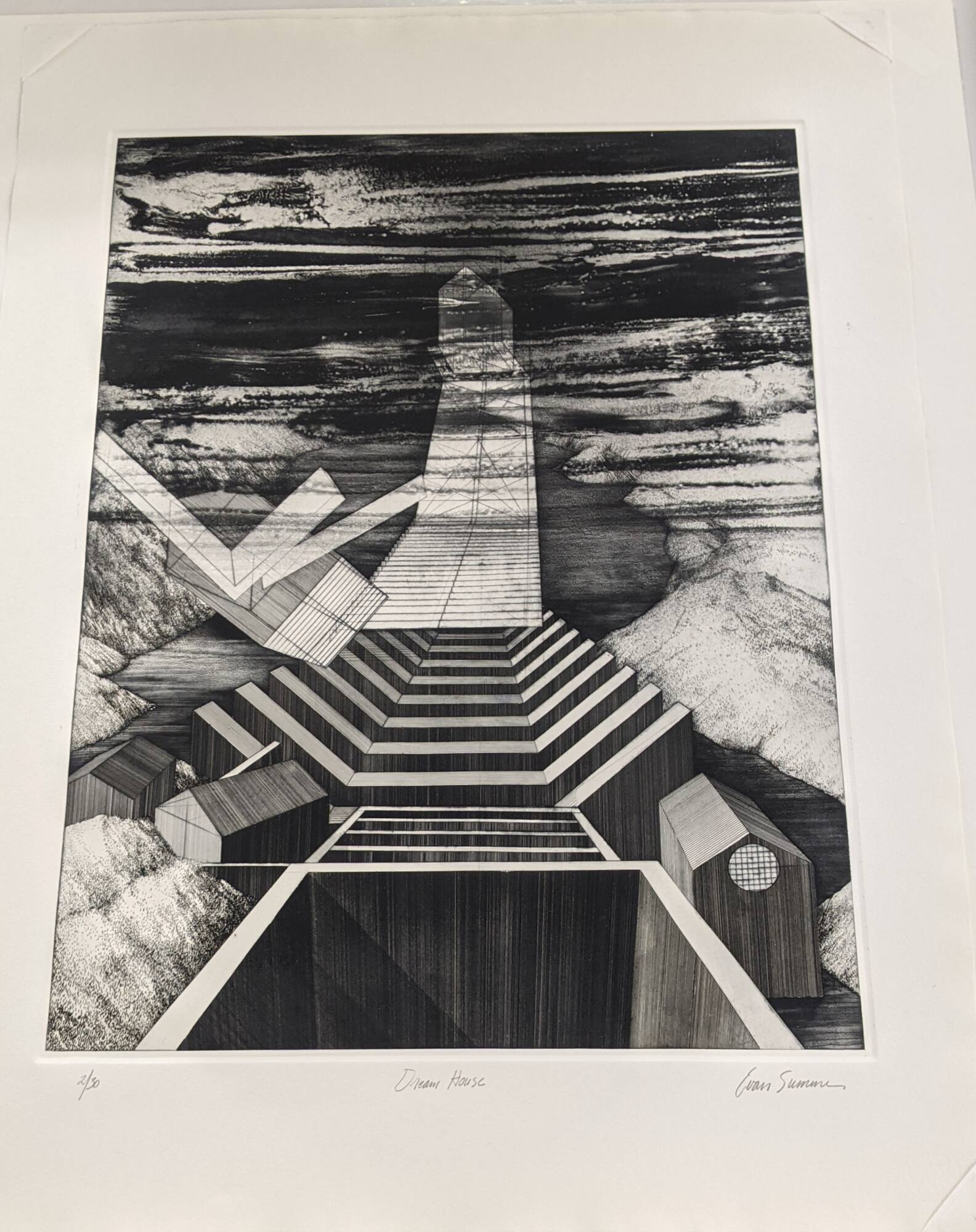 DescriptionImagined construction moving upwards from bottom of print skyward. Geometric shapes open box like area at base, with steps of sorts leading up a path toward point in sky. Surrounded by cloudlike streaks and shapes representing sky and clouds.Copyright© Evan David Summer
