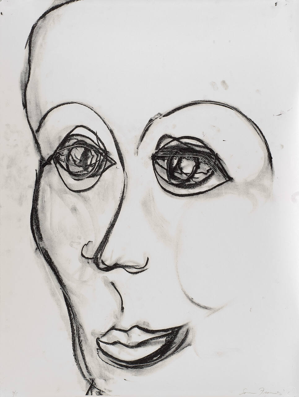 DescriptionThis aquatint shows a face in ¾ view. A vertical line running from top to bottom along the left side of the face depicts the forehead, cheekbone and cheek, and terminates at the chin. To the right of this vertical line are two brows, eyes, nose and lips.Copyright© Sam Francis Foundation, California / Artists Rights Society (ARS), New York