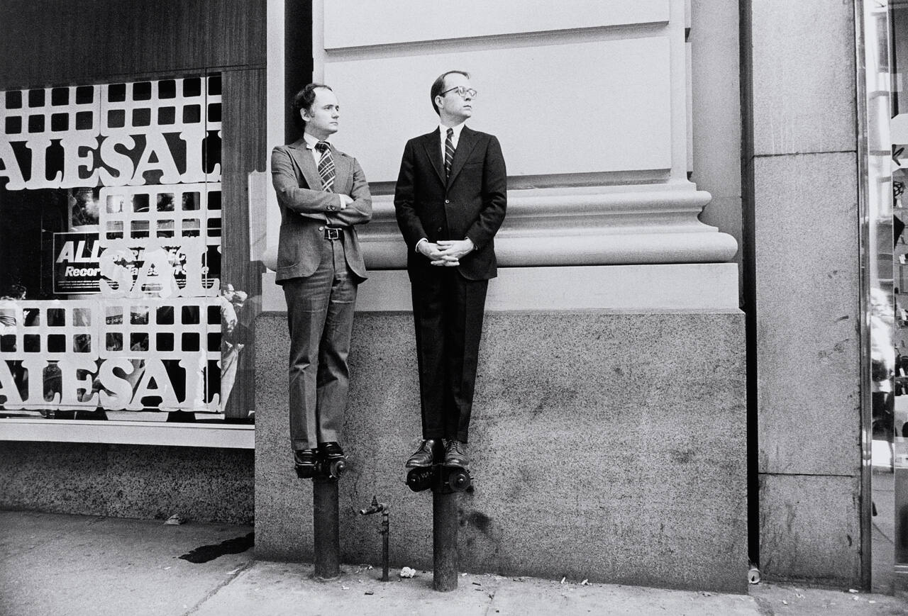 InscribedVerso in pencil UL: #1932 / UR: 5/15 / Across bottom LL: TWO MEN ON STANDPIPES WATCHING PARADE, 1975
