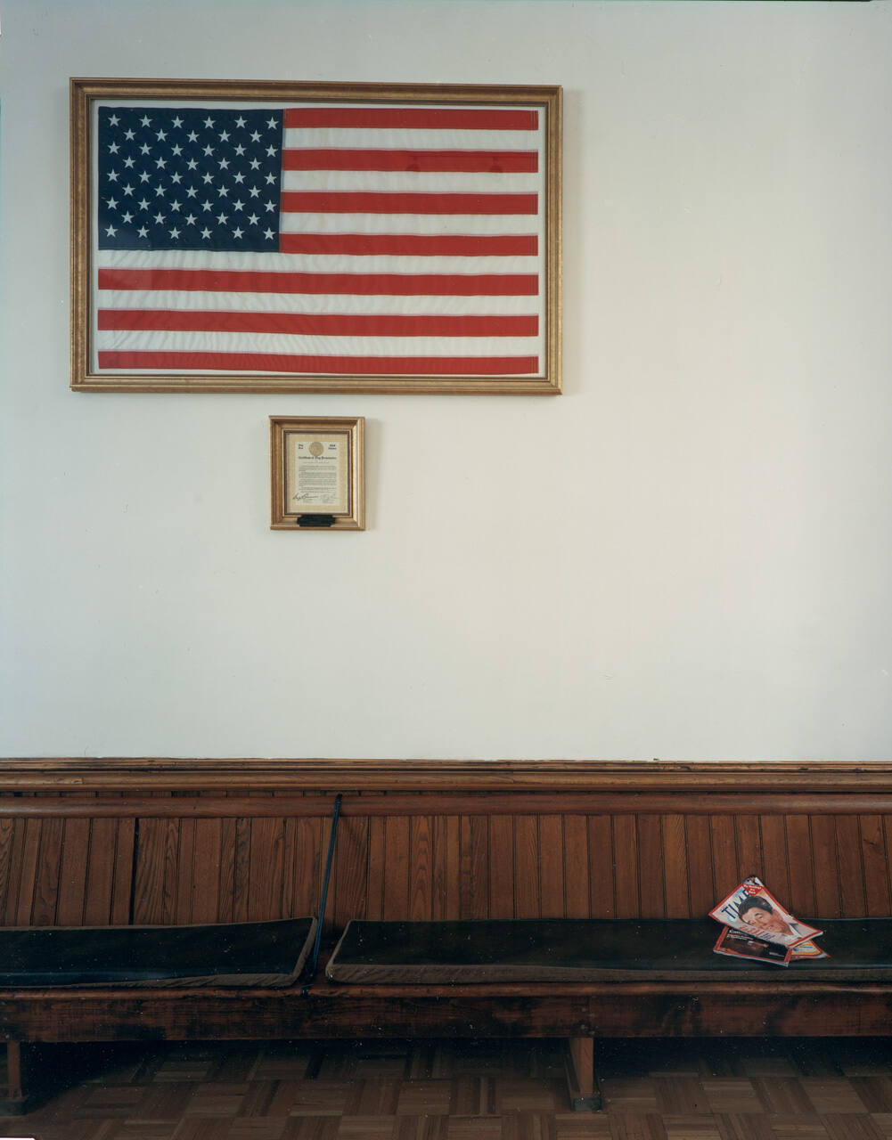 DescriptionVintage c-print. Courthouse bench with framed American flag hanging on wall.Gallery LabelDuring his brief artistic career in the 1980s, Bruce Wrighton photographed working-class subjects in and around his home in the city of Binghamton, in upstate New York. In these spare, architectural interiors, Wrighton focused on certain symbolic elements of the minimal décor, such as the American flag and the painted image of Jesus Christ. By giving these familiar icons formal significance within his composition, Wrighton encourages us to contemplate the way these symbols function as a means to transcend mundane environments.