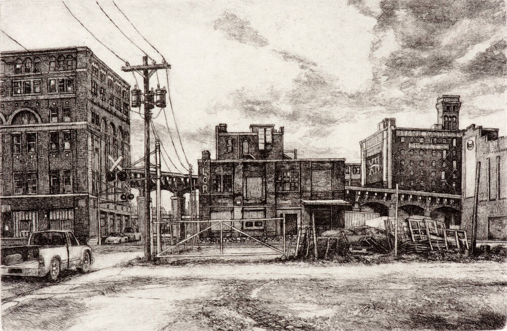 DescriptionBlack and white scene of buildings, street, and electrical poles with white clouds in the sky. At the left of image is a pick-up truck, as seen from behind, with the bed open and what looks like several boards in the back. Straight-on view is of several fences and pile of windows stacked at right.Gallery LabelDuring the 1990s, Douglas L. Osa created many prints that captured the essence of the West Bottoms. After a 10-year hiatus, Osa returned to the area. "My interest in the West Bottoms was in capturing the rich blend of architecture and railroads that had evolved during the previous century," he notes. "By the late 1990s there was a revitalization underway and much of the old, dilapidated character of the area was being erased."