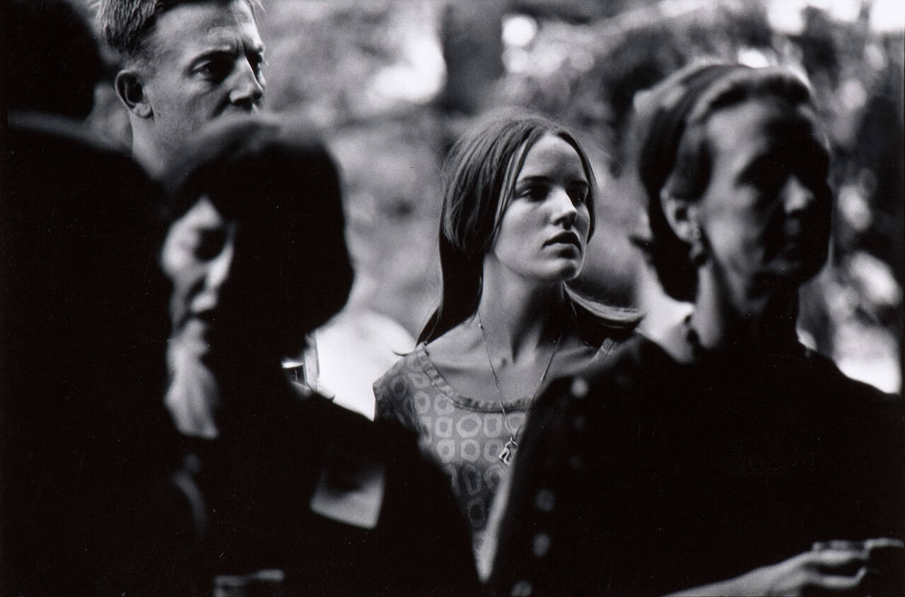 DescriptionTwo blurred females in foreground. Image focused on woman in printed dress in center of frame.Exhibition HistoryMultitude, Solitude: The Photographs of Dave Heath. Philadelphia Museum of Art, Philadelphia, PA, September 19, 2015 – February 21, 2016, The Nelson-Atkins Museum of Art, Kansas City, MO, November 19, 2016 – March 19, 2017, 232.