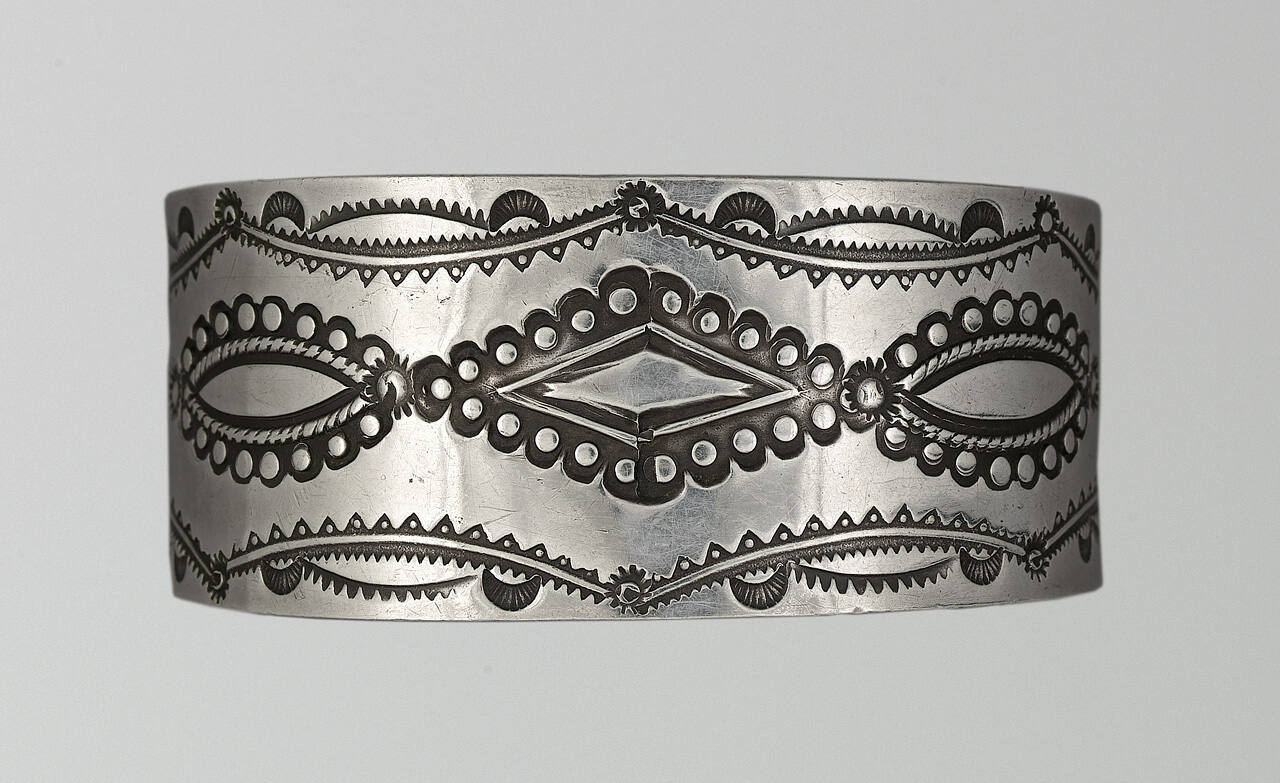 DescriptionSilver cuff bracelet stamped with a central diamond, flanked by two elliptical shapes all outlined with circles. The edges of the bracelet are stamped with large arches over opposing sets of three arches.CopyrightThis work is copyrighted. Contact the copyright holder for permission to reproduce.