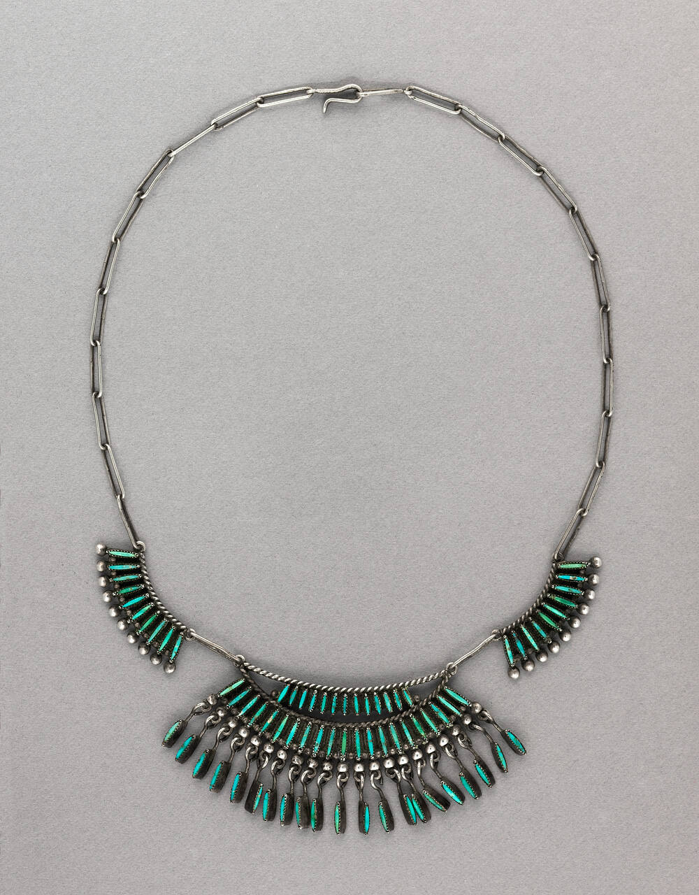 DescriptionSterling silver chain necklace set with numerous small elongated turquoise cabochons. Central pendant consists of two rows of turquoise further adorned with turquoise suspensions, flanked by two smaller arches also set with turquoise.CopyrightThis work is copyrighted. Contact the copyright holder for permission to reproduce.