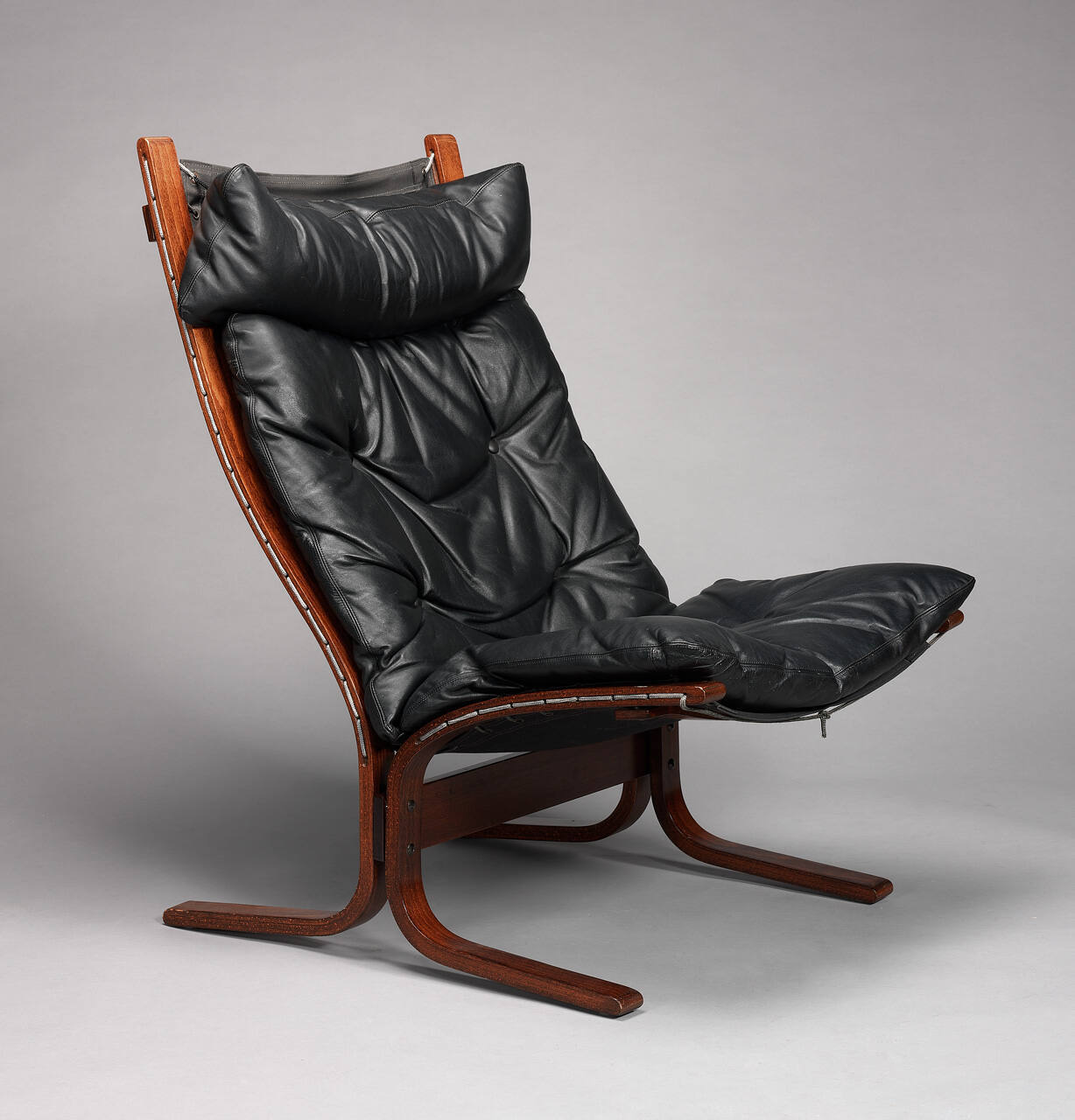 DescriptionChair with stained bentwood frame connected underneath by a stretcher and cord threaded into the frame sides with black tufted leather cushions.Gallery LabelSimple, accessible and ergonomic forms were the height of sophistication and comfort for many Europeans and Americans in the 1960s and 1970s. The elegant, bent laminated wooden frame of the Siesta Chair cradles a leather cushion allowing the user to be supported and relaxed. The Orbiter Floor Lamp allows the user to adjust the thin, highly functional arm to any position. Both the furniture and lamp are still in production today, a testament to their enduring place as exemplars of modern design.