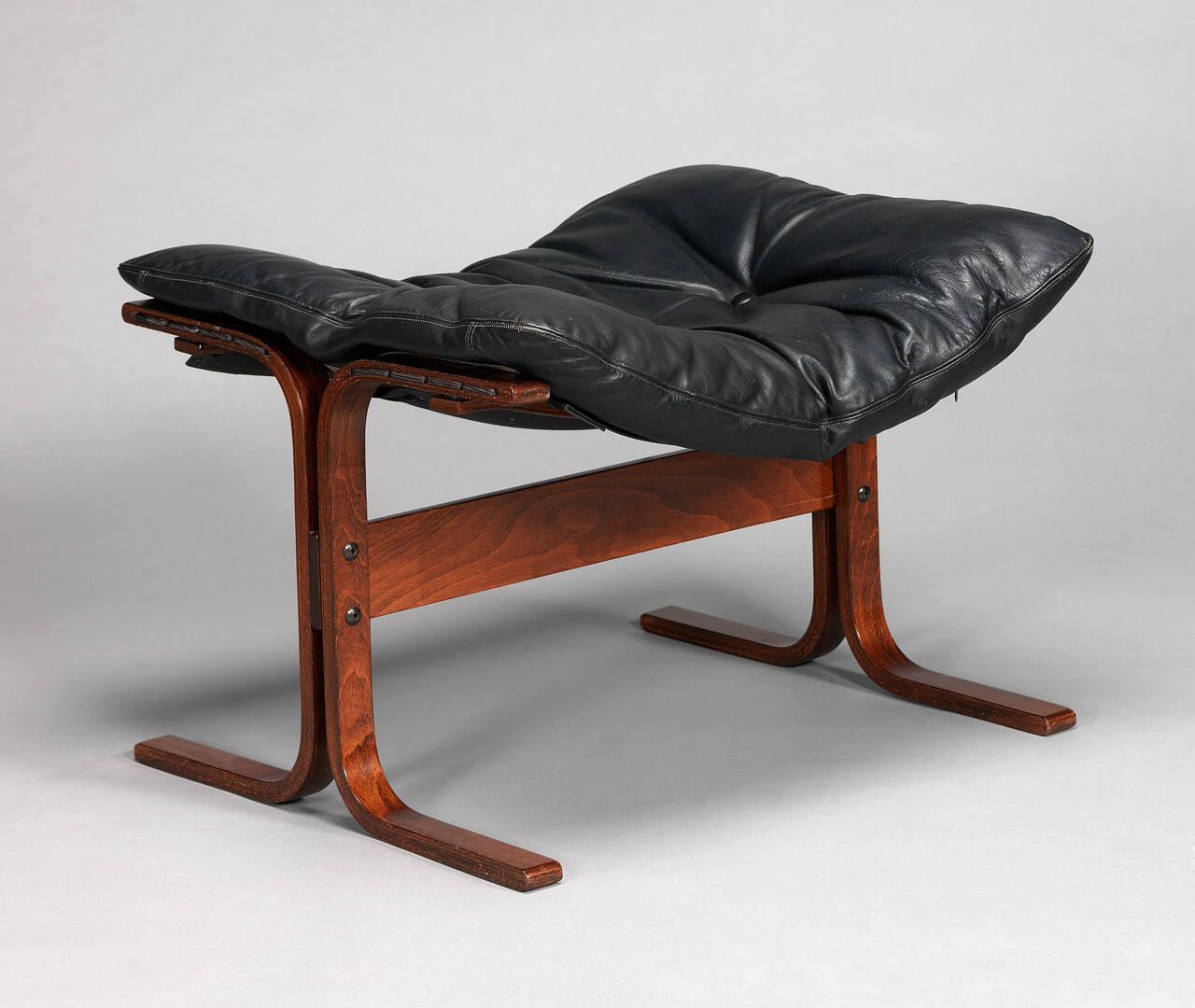 DescriptionStained bentwood frame (A) connected underneath by a stretcher and cord threaded into the frame sides with black tufted leather cushion (B).CopyrightThis work is copyrighted. Contact the copyright holder for permission to reproduce.