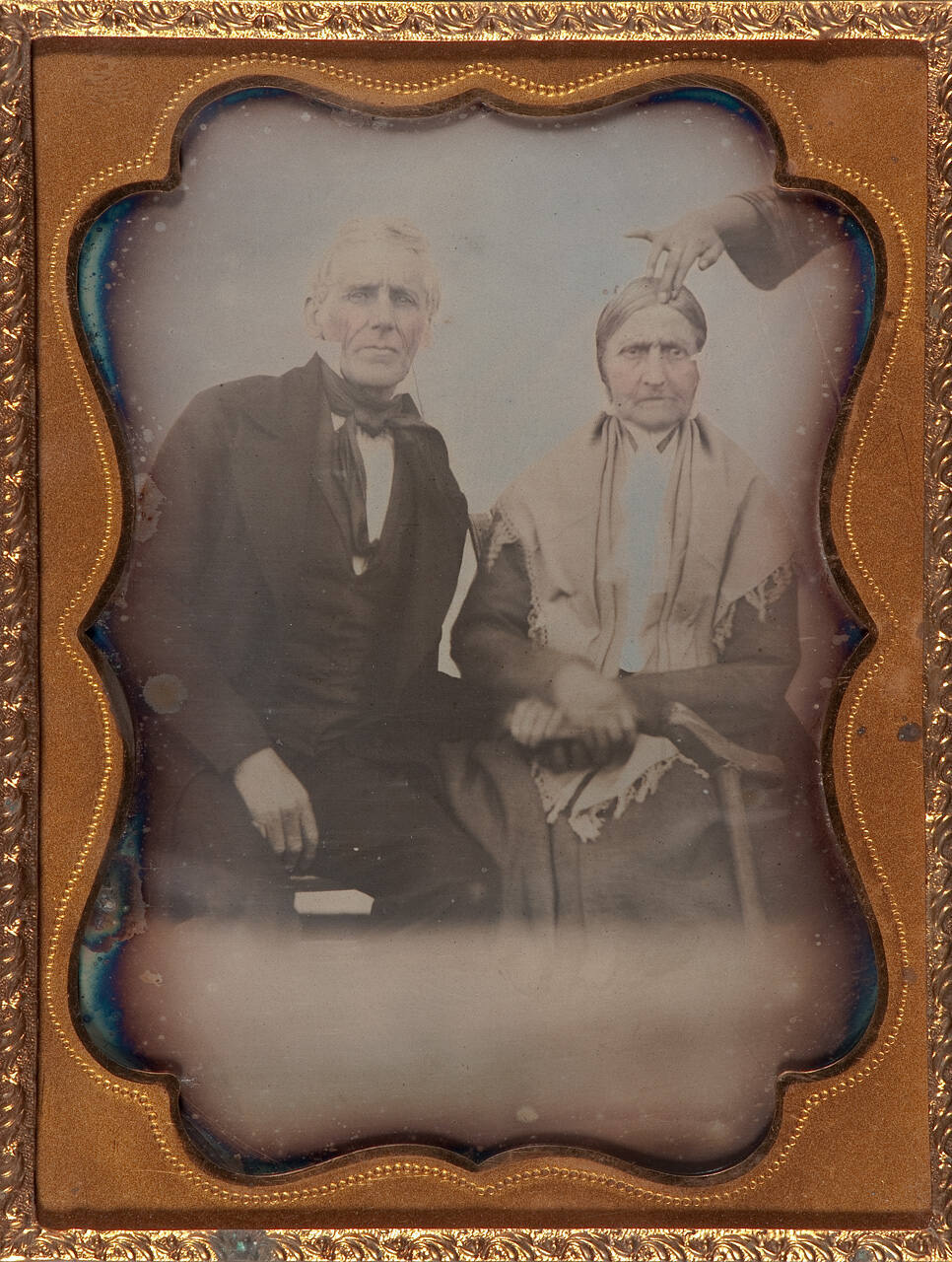 DescriptionImage of older man and elderly woman who is palsied sitting in chairs; an outside hand from someone is placed atop the woman’s head to steady her during the exposure; there is a white haze at bottom (some sort of vignetting) across bottom.Case: Leather case; brass mat; red velvet liner