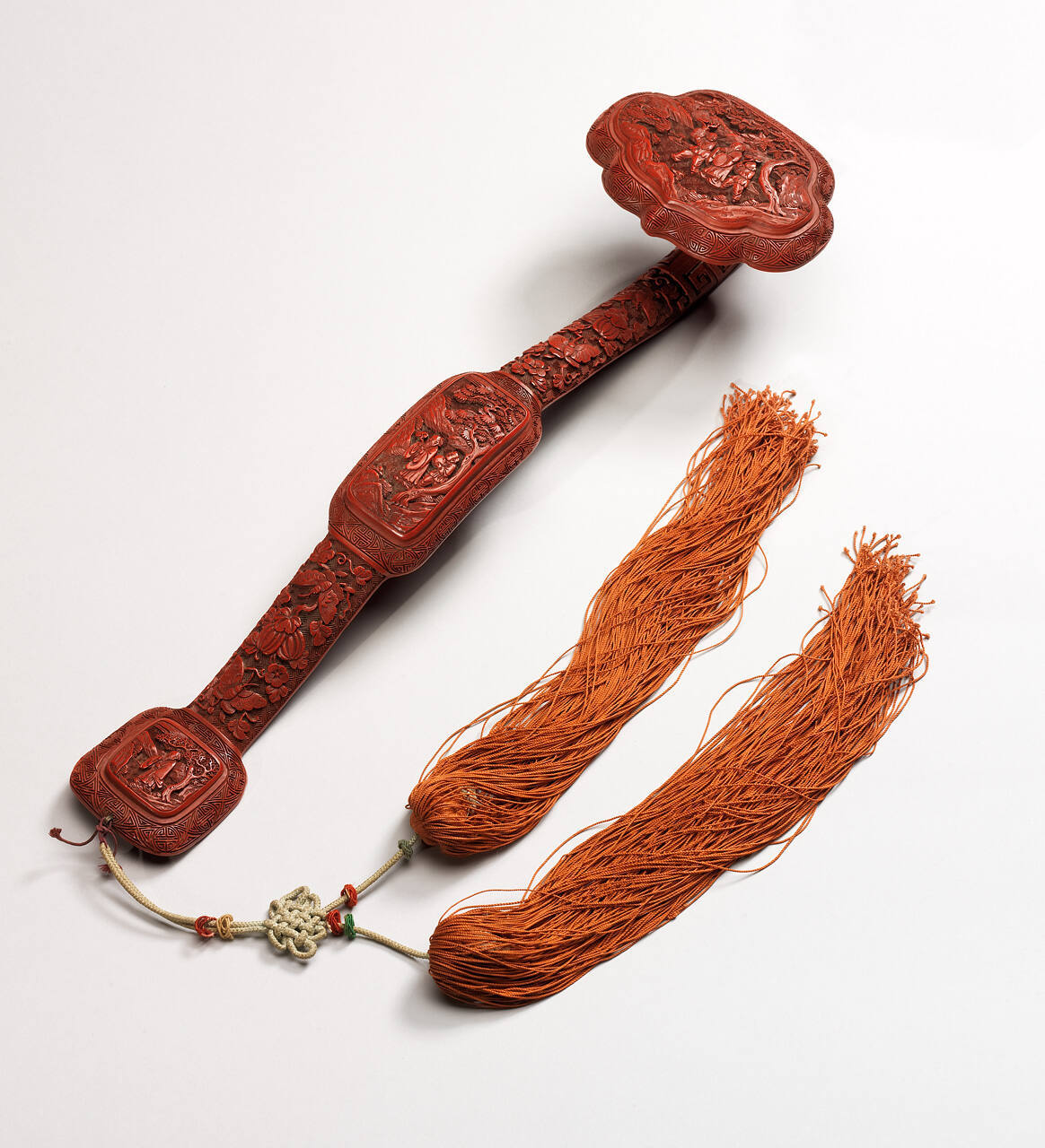 DescriptionCinnabar red lacquer ruyi (“wish fulfilling”) scepter is in the form of an S-curve with large ogival head, and thickened mid- and end-sections. The lacquer has been built up in layers and then carved in high relief with images of Daoist immortals. On the head panel an immortal accompanied by two boy servants holding the fungus of immortality walks in a landscape; in the middle panel an immortal carries the fungus and is accompanied by a servant carrying a peach; in the lower panel the immortal carries the peach; the intervening sections decorated with butterflies, melons, and plum blossoms.Gallery Label