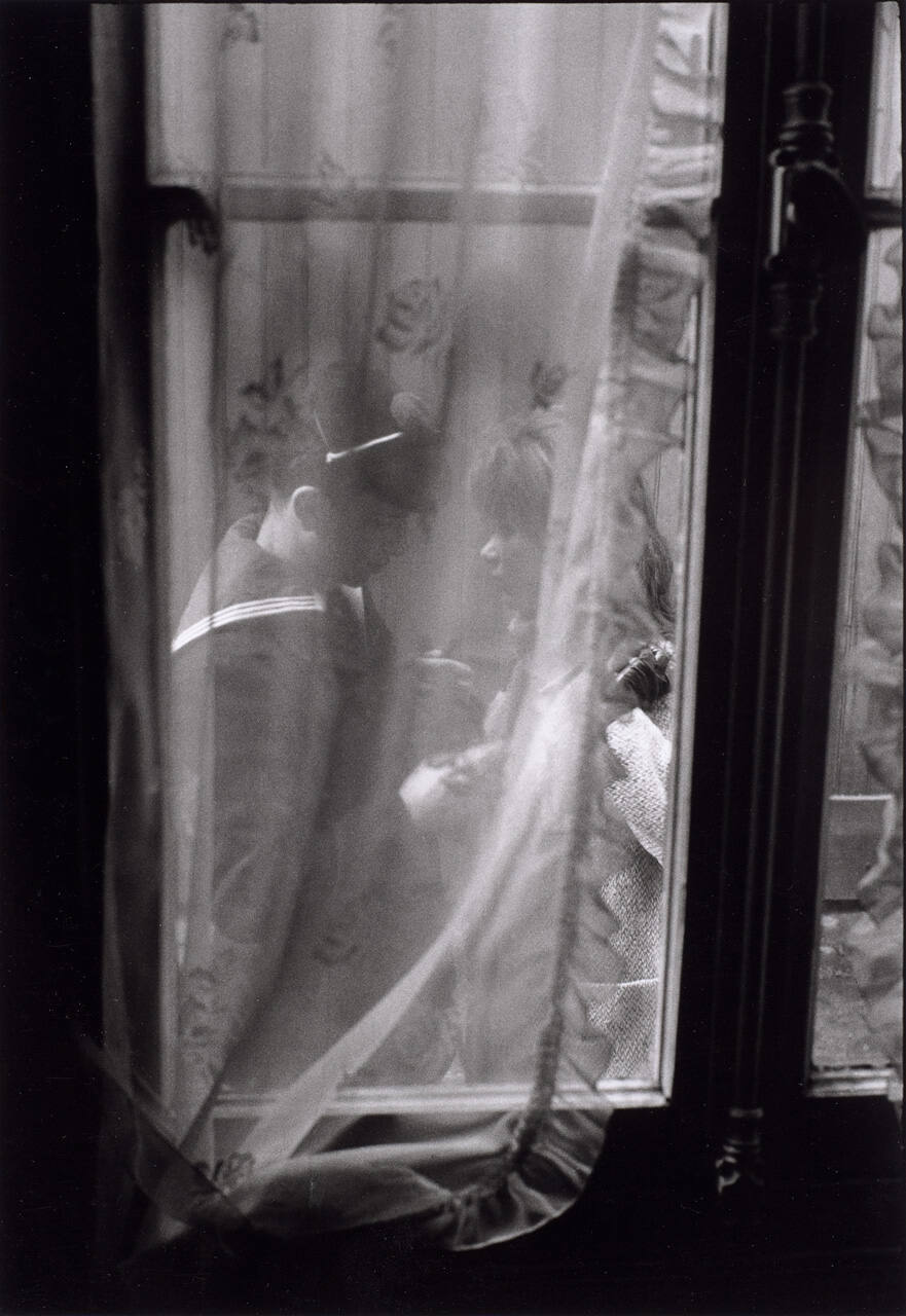 DescriptionImage of a couple as seen through a window with sheer curtains; man wearing uniform.Copyright© The Estate of Willy Ronis