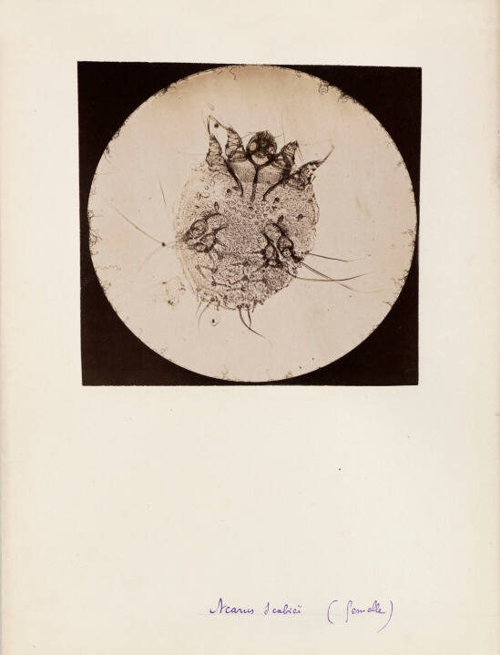 InscribedOn mount recto, bottom, in blue pen: "Acarus scabiei (femelle)";