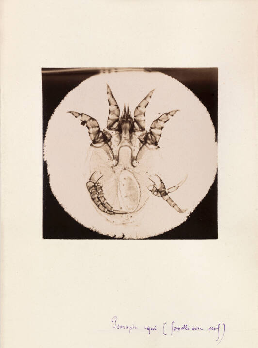 InscribedOn mount recto, bottom, in blue pen: "Psoropte equi (femelle avec oeuf)";