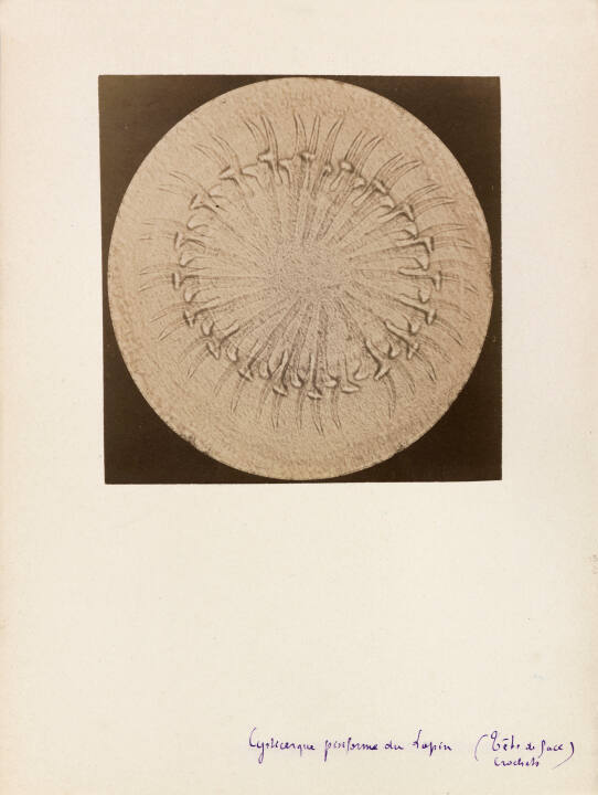 InscribedOn mount recto, bottom, in blue pen: "Cystecerque pisiforme du lapin (tete du face crochets)";