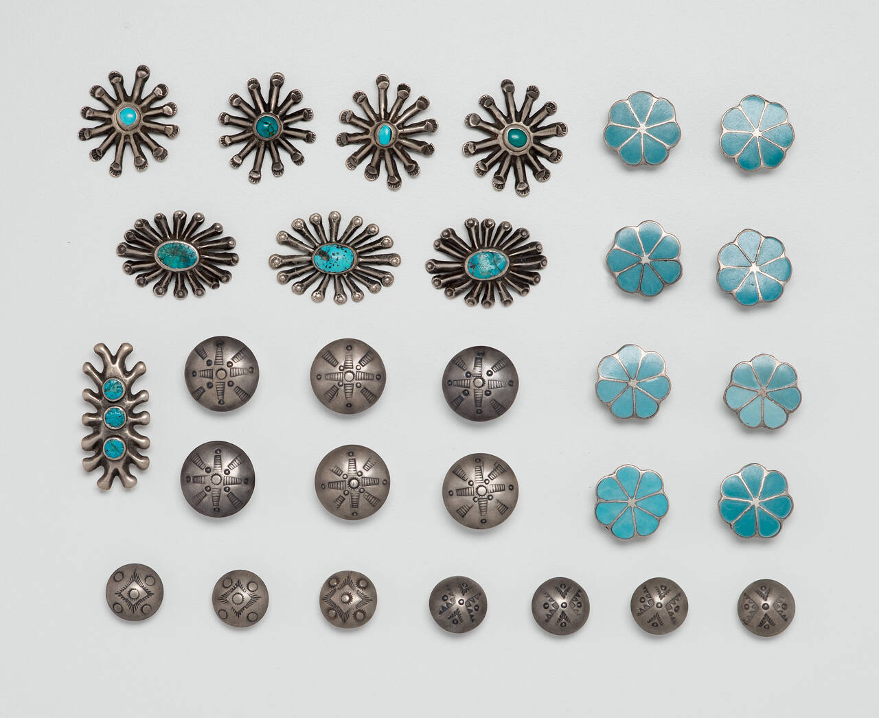 DescriptionCollection of silver buttons of various sizes and designs, some are inlaid with turquoise