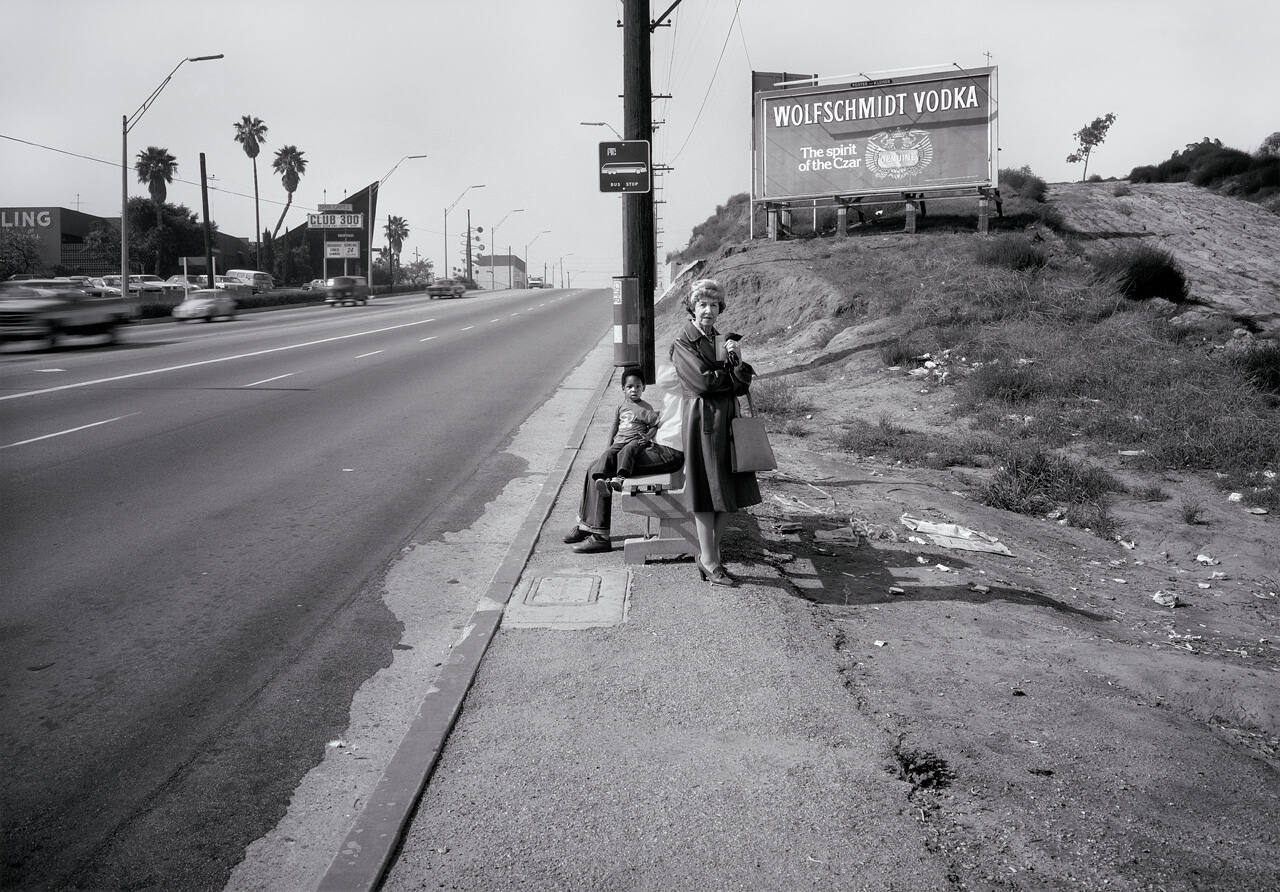 DescriptionImage of an older woman standing near bus bench where a little boy and partially visible man are seated; Wolfschmidt Vodka billboard and multi-lane thoroughfare visible in background.Copyright© Anthony Hernandez