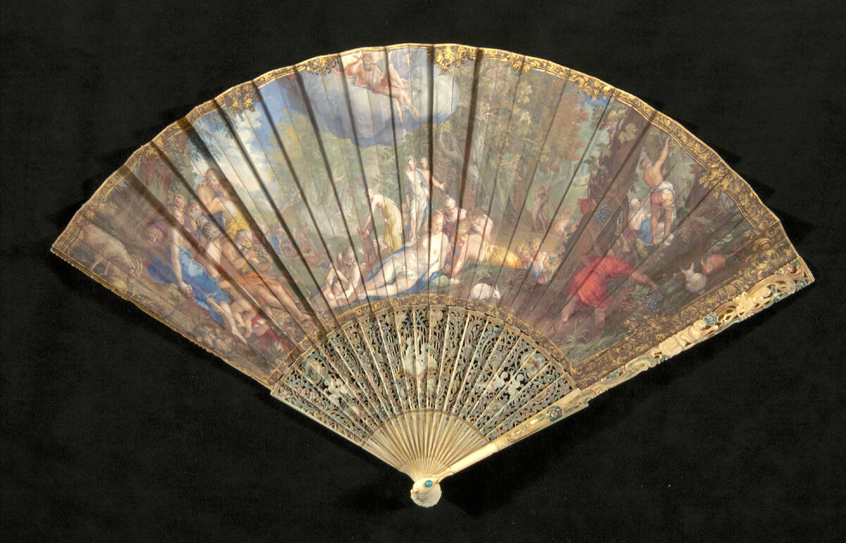 DescriptionSpines delicately carved in floral, figural, avian, and scroll forms, polychromed. Obverse: idyllic forest scene densely peopled with draped human figures; goat and dogs, far l., rabbits, far r.; sleeping bearded man with scythe in sky, top center. Reverse: spacious landscape with grazing sheep, l., ruins l. and center and a few figures, r.ProvenanceWith J. Duvelleroy, Ltd., London, by 1959;