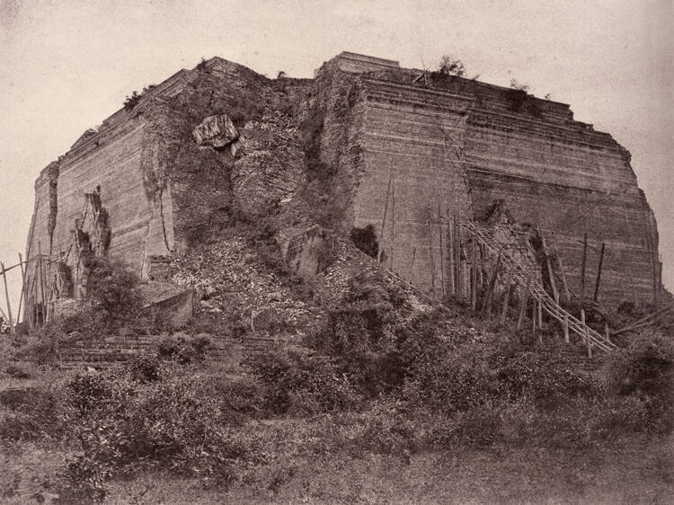 InscribedOn mount recto, bottom center, in black type:“No. 98 Mengoon Pagoda from S.E. / This corner shows the effects for the earthquake most completely. On reaching the top by it, the surface is seen rent into broad and deep fissures ― a glacier in brickwork.”