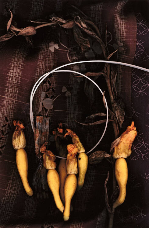 DescriptionImage of five yellow squash on top of fabric with floral and linear designs.