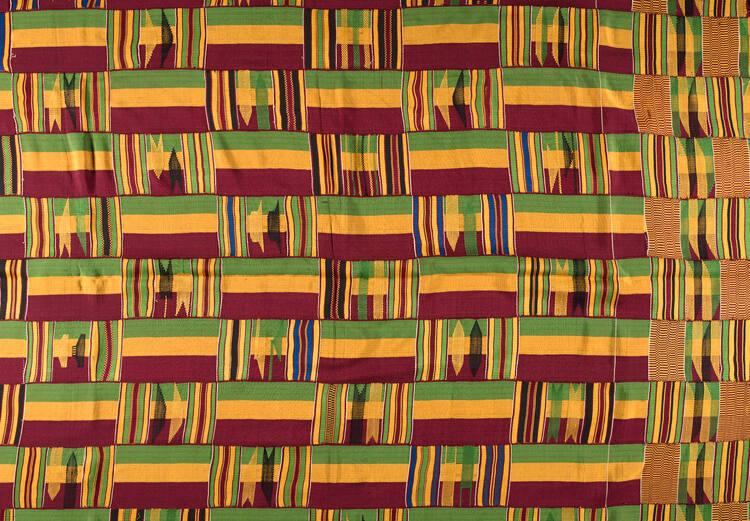 DescriptionThis cloth is strip-woven and the medium is silk, which is considered the most prestigious in Akan culture. Its design consisting of bold geometric patterns rendered in dominant red, yellow and green colors identify it as Oyokoman. Before the 20th century, the Oyokoman cloth design was considered the prerogative of the Oyoko clan, whose members were considered the sole legitimate heirs to the Asante monarchy. The cloth’s large size suggests that it was intended for a man. This kind of composition is still associated with Asante courtiers and wealthy individuals, though the restrictions on who can purchase them are no longer strictly enforced.ProvenanceWith John Akwasi Adu Agyei, Kenteland Enterprise, Accra, Ghana, by 2012 [1];