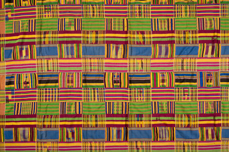 DescriptionThis cloth is strip-woven and the medium is silk, which is considered the most prestigious in Akan culture. Its relatively small size suggests that it was perhaps owned by a woman. Unlike the ordinary kente cloth, which is often composed of a single consistent pattern throughout the design, this piece was created from individual strips taken from different cloths, hence the name nsasawa (mix-mix). That kind of mixed composition is often associated with the wealthy in Akan culture, as it advertises the wearer as the owner of many cloths.ProvenanceWith John Akwasi Adu Agyei, Kenteland Enterprise, Accra, Ghana, by 2012 [1];