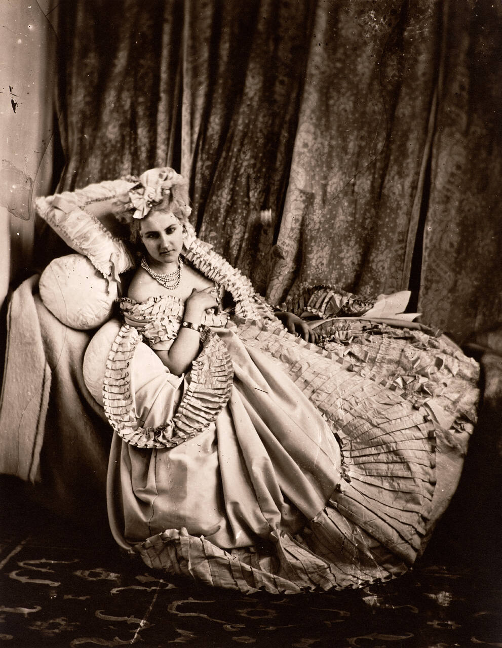 DescriptionPortrait of a woman wearing an elaborate gown while reclining against bolsters and pillows. She's wearing several strands of pearls and a large bow in her hair.ProvenancePurchased from Vintage Works, Chalfort, PA by The Hall Family Foundation, Kansas City, MO, 2013;