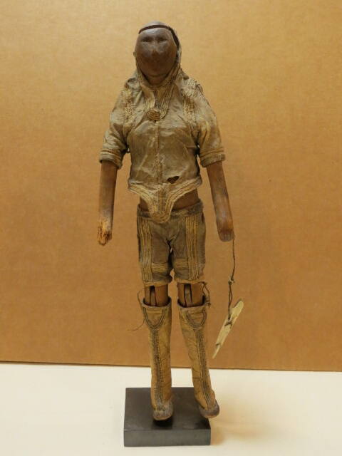 DescriptionArticulated wooden doll wearing a leather parka with hood and short sleeves, knee length pants, high leather boots, holding an arrow tip by a string in its left hand.
