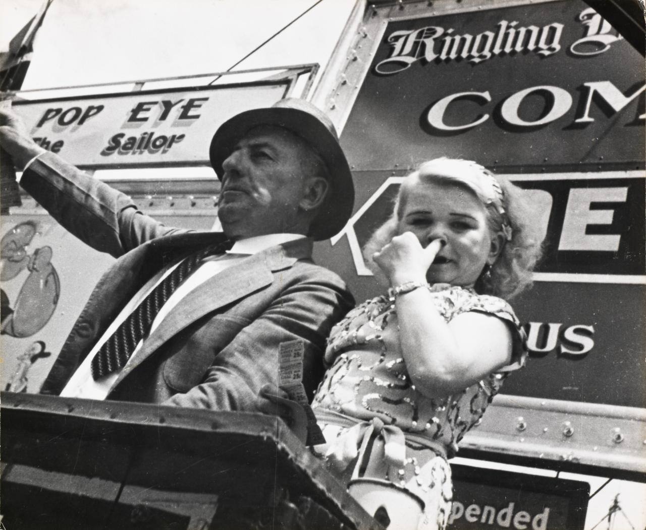 DescriptionImage of man wearing a suit standing next to woman who is wearing a sequined dress; Ringling Bros. sign in background.Copyright© Estate of Kenneth and Edna Heilbron