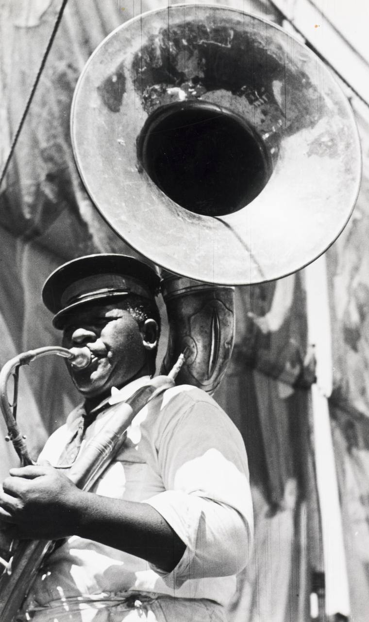DescriptionImage of man wearing a brimmed hat and collared shirt playing the tuba.Copyright© Estate of Kenneth and Edna Heilbron