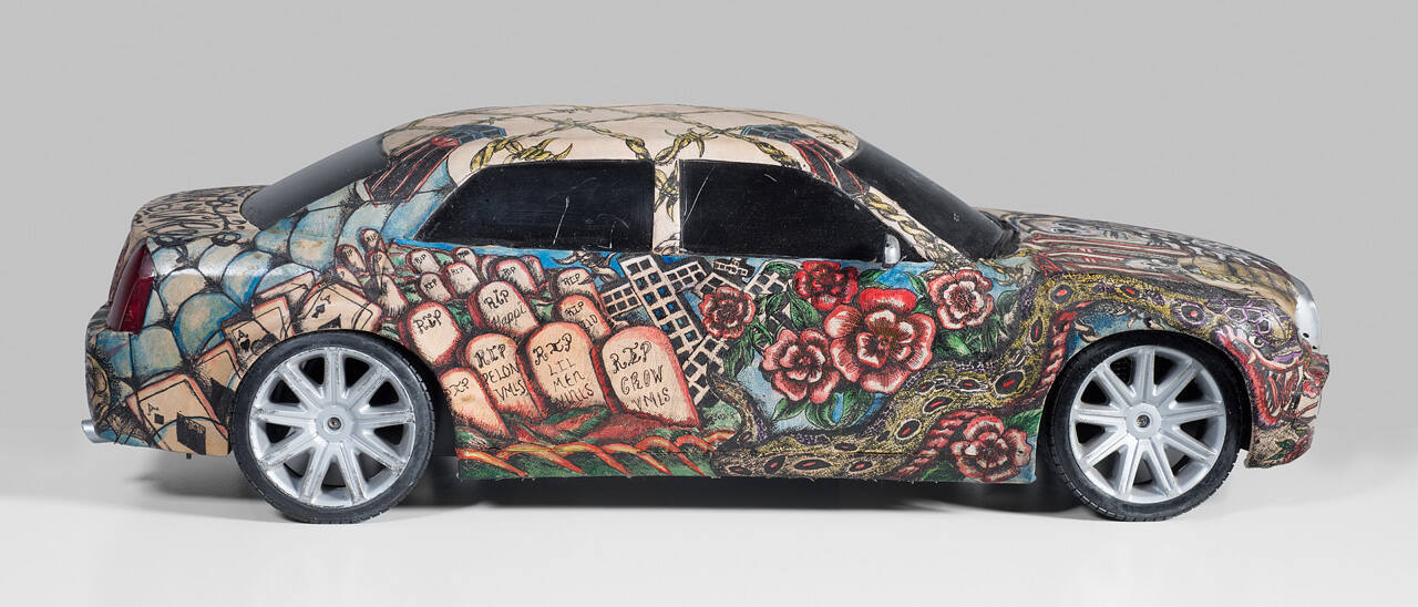 DescriptionThis sculpture is a remote control car covered with tattooed pig skin. The tattoos depict skeletons on the hood of the car along with other motifs, including roses, barbed wire, and grave markers.Copyright© Betsabeé Romero