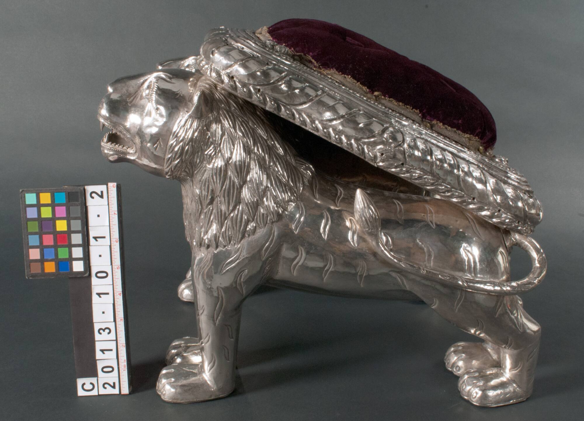 DescriptionThe set includes six objects: The thrones are a pair, created for the king of Dungarpur, India. The thrones are large, Chippendale-style chairs, accompanied by matching foot rests, a chhatri and a chauri. The thrones are made of molded and carved silver, wrapped around a wooden frame. The thrones are covered with imagery, including molded and carved depictions of Hindu deities, animals, and floral designs. Large, lavishly designed peacocks protrude from the seat backs in moulded relief, with its tail spectacularly fanned and its wings wide open. Above these are a depiction of Hanuman, the Monkey God, one of the most famous and heroic Hindu deities, holding his mace in one hand, and a bunch of grapes in the other hand. Above Hanuman is a small deer or gazelle. The same relief of Hanuman decorates the other side of the seat back. Also notable are the striped lions that form the throne legs and support the arm rests of the thrones. These lions are detailed with open mouths and separate tongues. The seats and backs of the thrones and tops of the foot rests are upholstered with red velvet that exhibits areas of wear. The chhatri, or umbrella, is also modern, late 19th to early 20th century, and consists of pale blue silk with silver embroidery and silver thread, suspended on a metal umbrella frame. The chauri has a silver handle that appears stylistically to date to the late 19th century. The creamy white, now yellowing hair mounted on the handle comes from a horse or ox tail, traditional materials used to create fly whisks in ancient India. Originally thought to have been made for the use of the king and queen (Maharawal and Maharani), recent research suggests that if they were used together in court, they would have been used by the two highest ranking male rulers in a durbar setting, perhaps the maharawal seated with the crown prince, or even with a colonial ruler, like the Vicerory.Exhibition HistoryUnexpected Encounters, The Nelson-Atkins Museum of Art, Kansas City, Missouri, June 2–August 12, 2018, no cat.