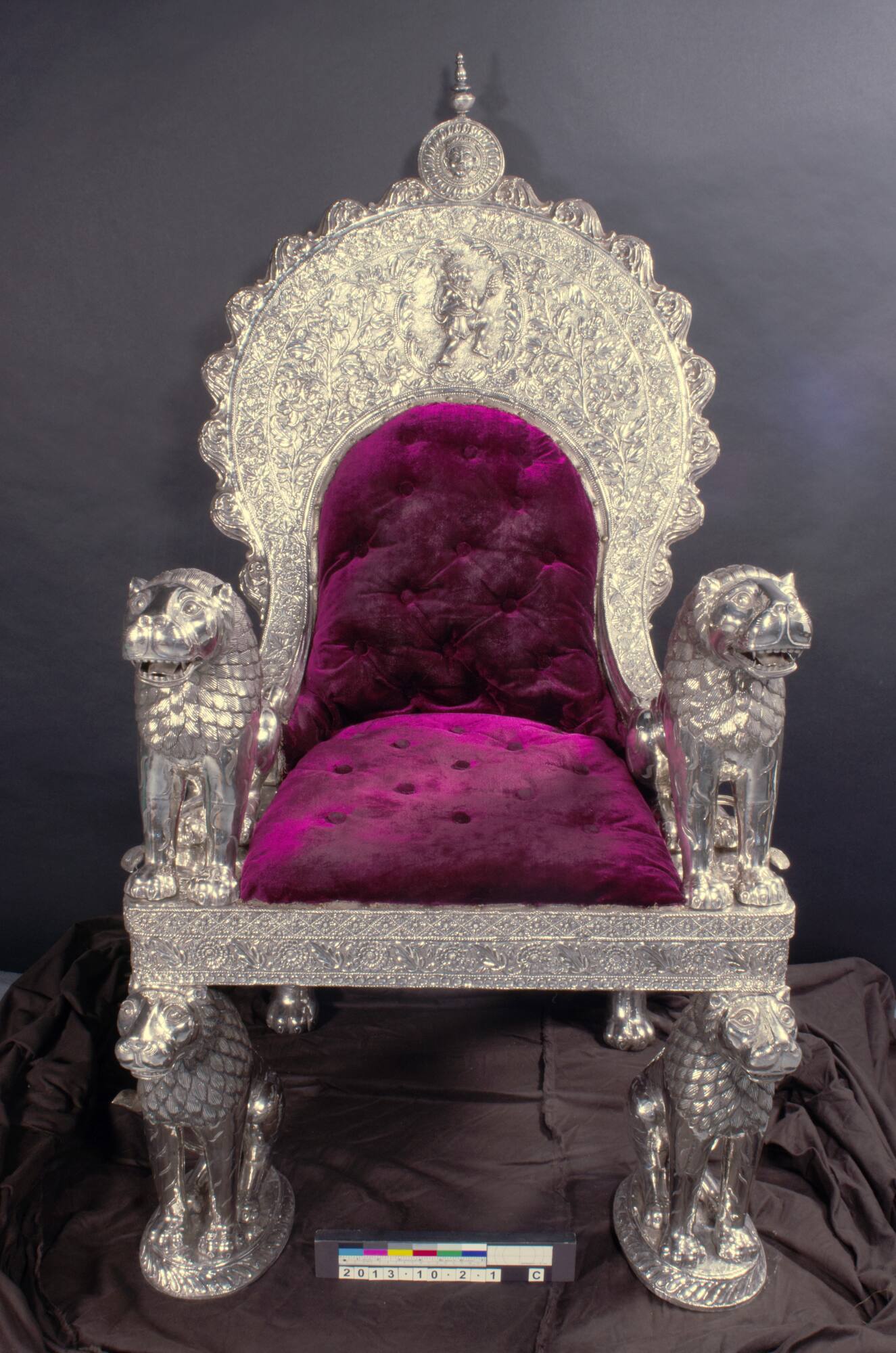 DescriptionThe set includes six objects: The thrones are a pair, created for the king of Dungarpur, India. The thrones are large, Chippendale-style chairs, accompanied by matching foot rests, a chhatri and a chauri. The thrones are made of molded and carved silver, wrapped around a wooden frame. The thrones are covered with imagery, including molded and carved depictions of Hindu deities, animals, and floral designs. Large, lavishly designed peacocks protrude from the seat backs in moulded relief, with its tail spectacularly fanned and its wings wide open. Above these are a depiction of Hanuman, the Monkey God, one of the most famous and heroic Hindu deities, holding his mace in one hand, and a bunch of grapes in the other hand. Above Hanuman is a small deer or gazelle. The same relief of Hanuman decorates the other side of the seat back. Also notable are the striped lions that form the throne legs and support the arm rests of the thrones. These lions are detailed with open mouths and separate tongues. The seats and backs of the thrones and tops of the foot rests are upholstered with red velvet that exhibits areas of wear. The chhatri, or umbrella, is also modern, late 19th to early 20th century, and consists of pale blue silk with silver embroidery and silver thread, suspended on a metal umbrella frame. The chauri has a silver handle that appears stylistically to date to the late 19th century. The creamy white, now yellowing hair mounted on the handle comes from a horse or ox tail, traditional materials used to create fly whisks in ancient India. Originally thought to have been made for the use of the king and queen (Maharawal and Maharani), recent research suggests that if they were used together in court, they would have been used by the two highest ranking male rulers in a durbar setting, perhaps the maharawal seated with the crown prince, or even with a colonial ruler, like the Vicerory.Exhibition HistorySilver Splendor: Conserving the Royal Thrones of Dungarpur, India, The Nelson-Atkins Museum of Art, Kansas City, Missouri, May 2, 2022–July 16, 2023, no cat.