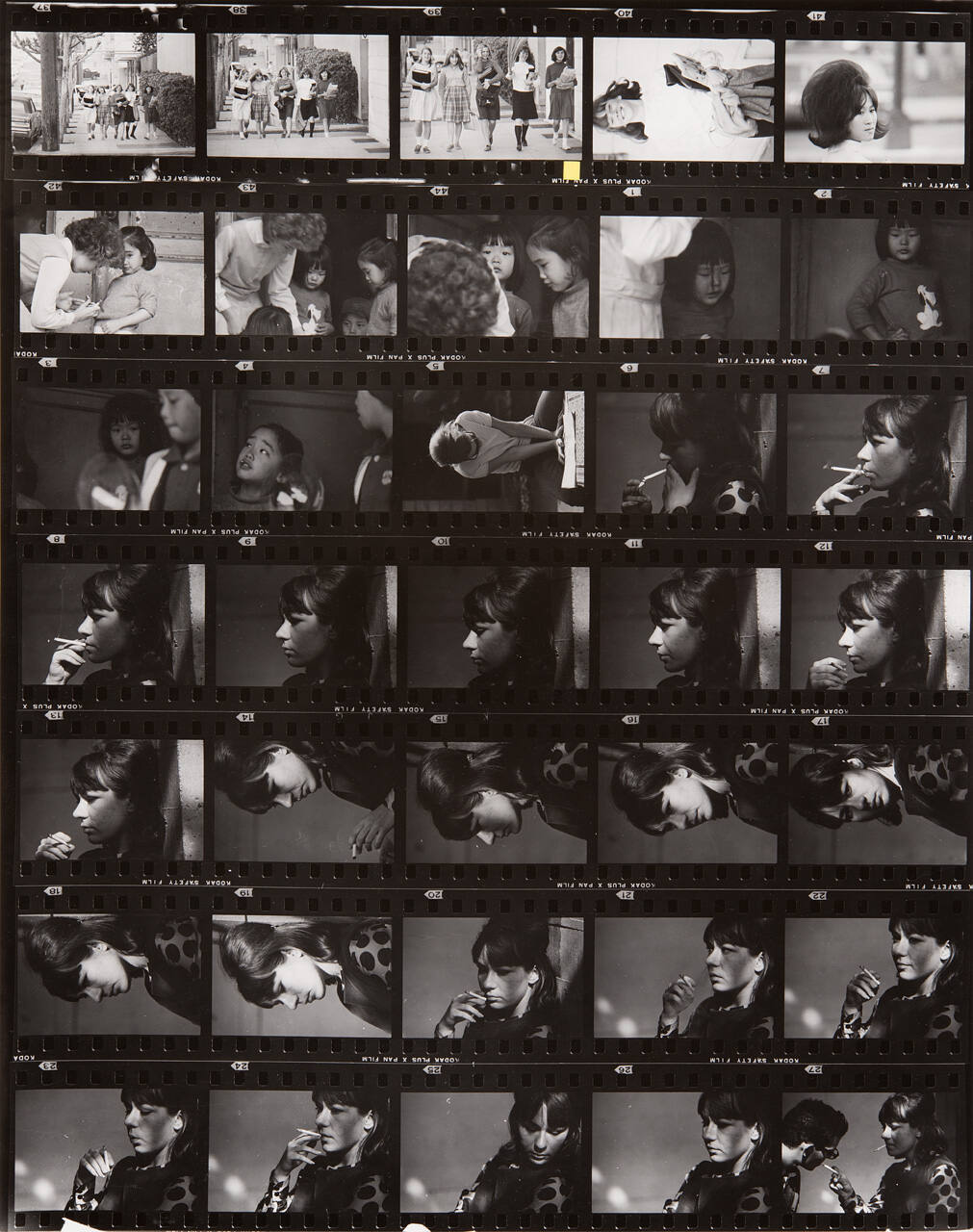 DescriptionContact sheet of Guggenheim work Roll #727-733; upper left frame is an image of five girls wearing skirts and holding books while walking down the sidewalk.ProvenanceHall Family Foundation, Kansas City, MO, 2013;