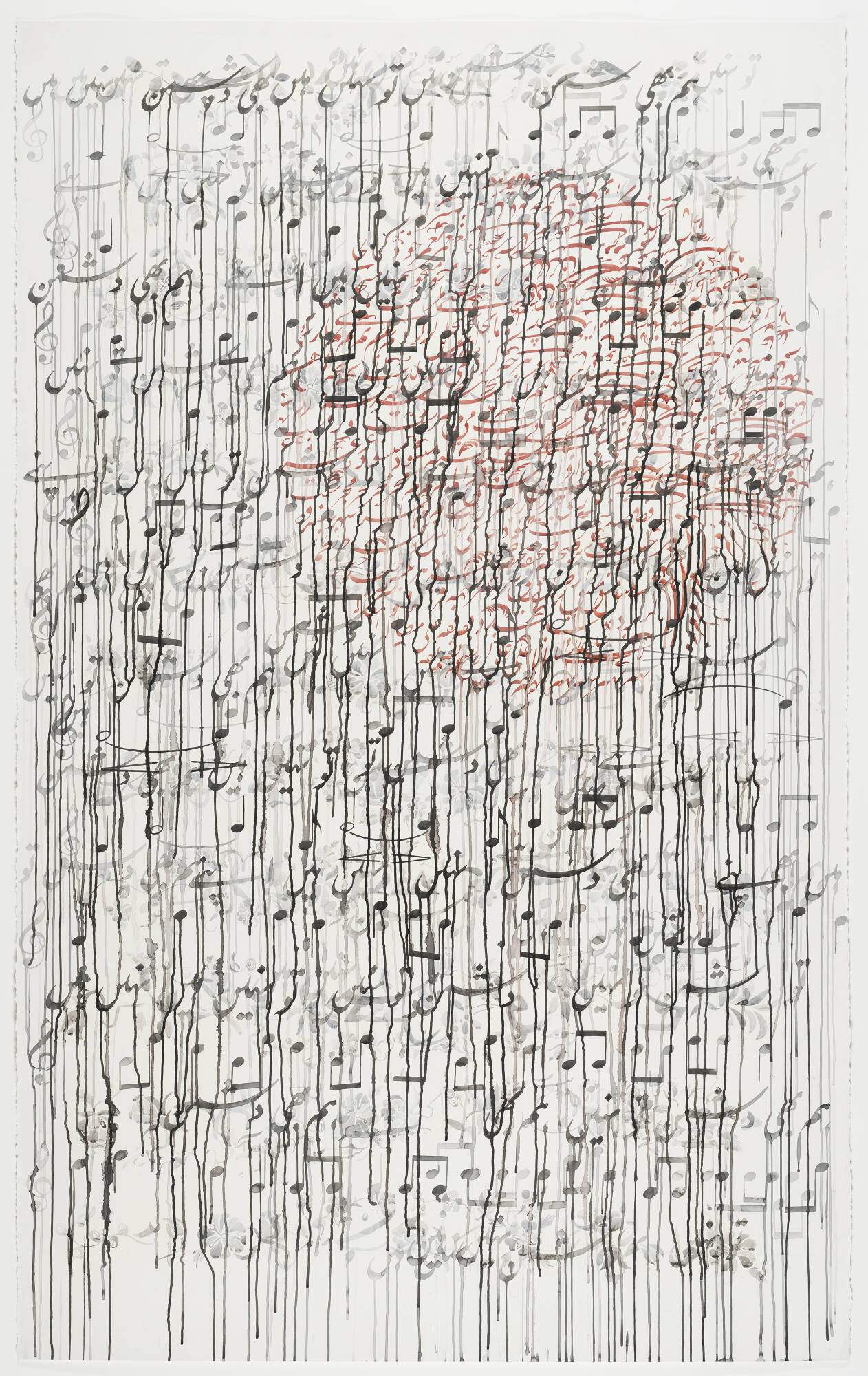 DescriptionThis large-scale calligraphic drawing is oriented vertically. Lines of nasta’liq calligraphy are drawn in black and red ink against a lustrous white ground which is sporadically ornamented with floral blossoms. The calligraphic lines are juxtaposed with musical notation, creating a large text page which reveals the interplay of two languages, Urdu and music. A dense application of calligraphy written in red ink in various directions creates a circular shape in the top, right of the composition, reminiscent of a seal. The entire composition is further activated by layers of horizontal drips of ink and paint.Exhibition HistorySharjah Biennial 11, 2013, Sharjah, United Arab Emirates, March – May 2013, no cat.