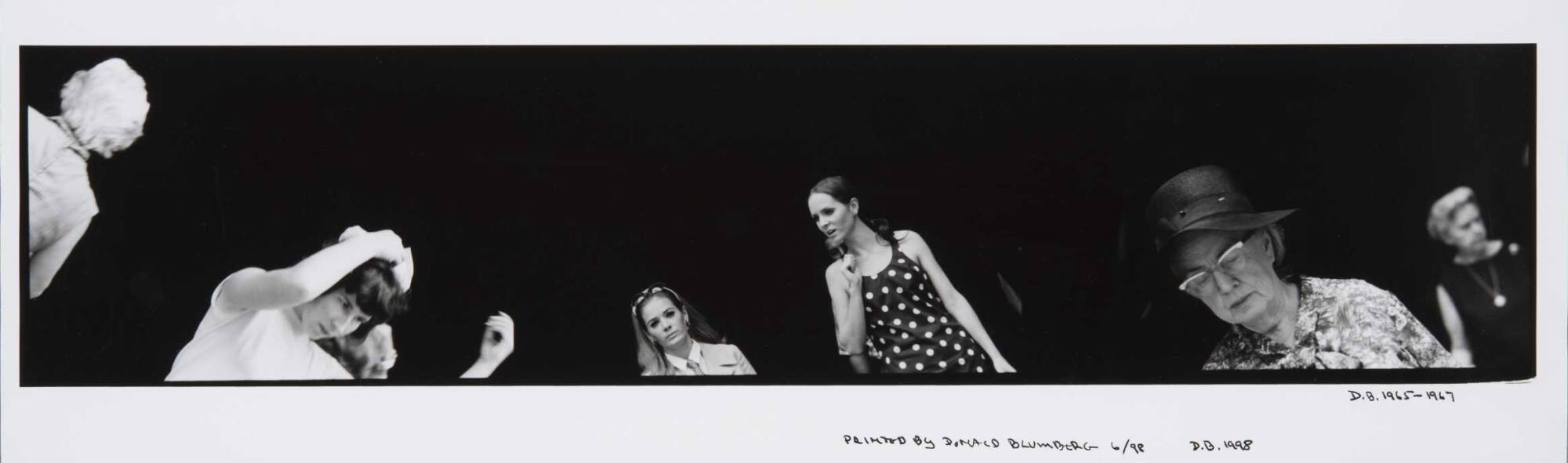 DescriptionPanoramic image of women of various ages set against a black background and truncated by the frame's bottom edge.Copyright© Donald Blumberg