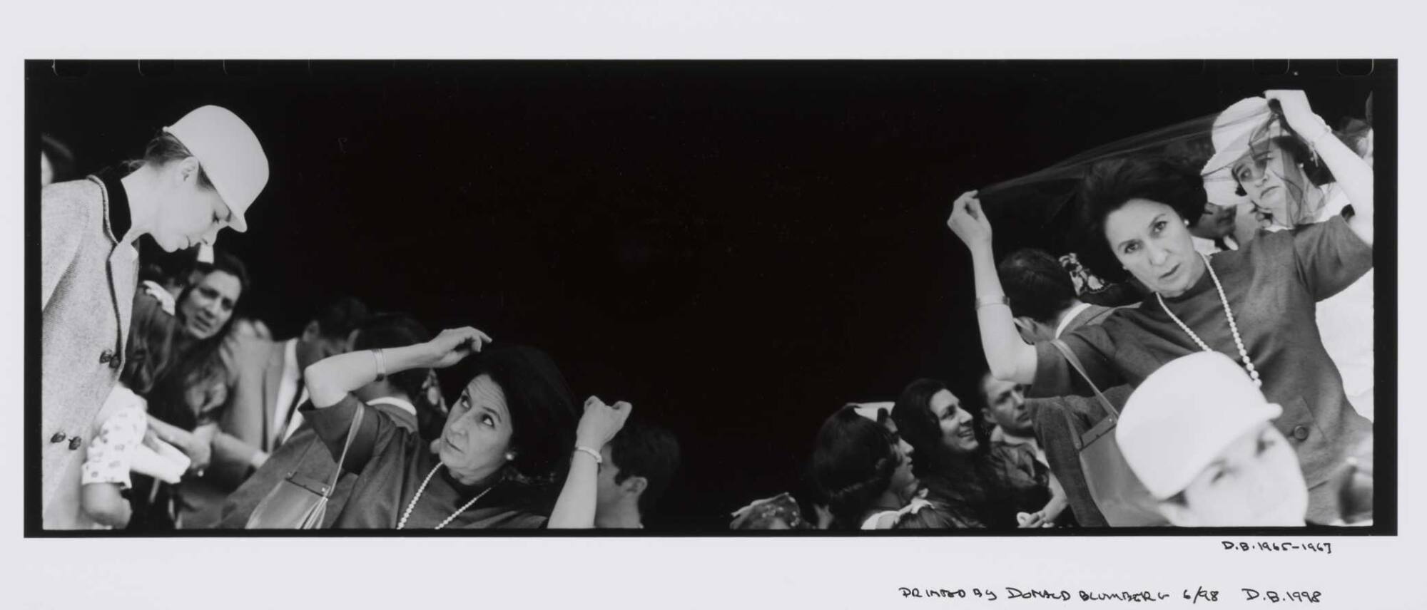 DescriptionPanoramic image composed of contiguous frames showing numerous figures against a black background including a woman wearing head scarf and pearl necklace.Copyright© Donald Blumberg