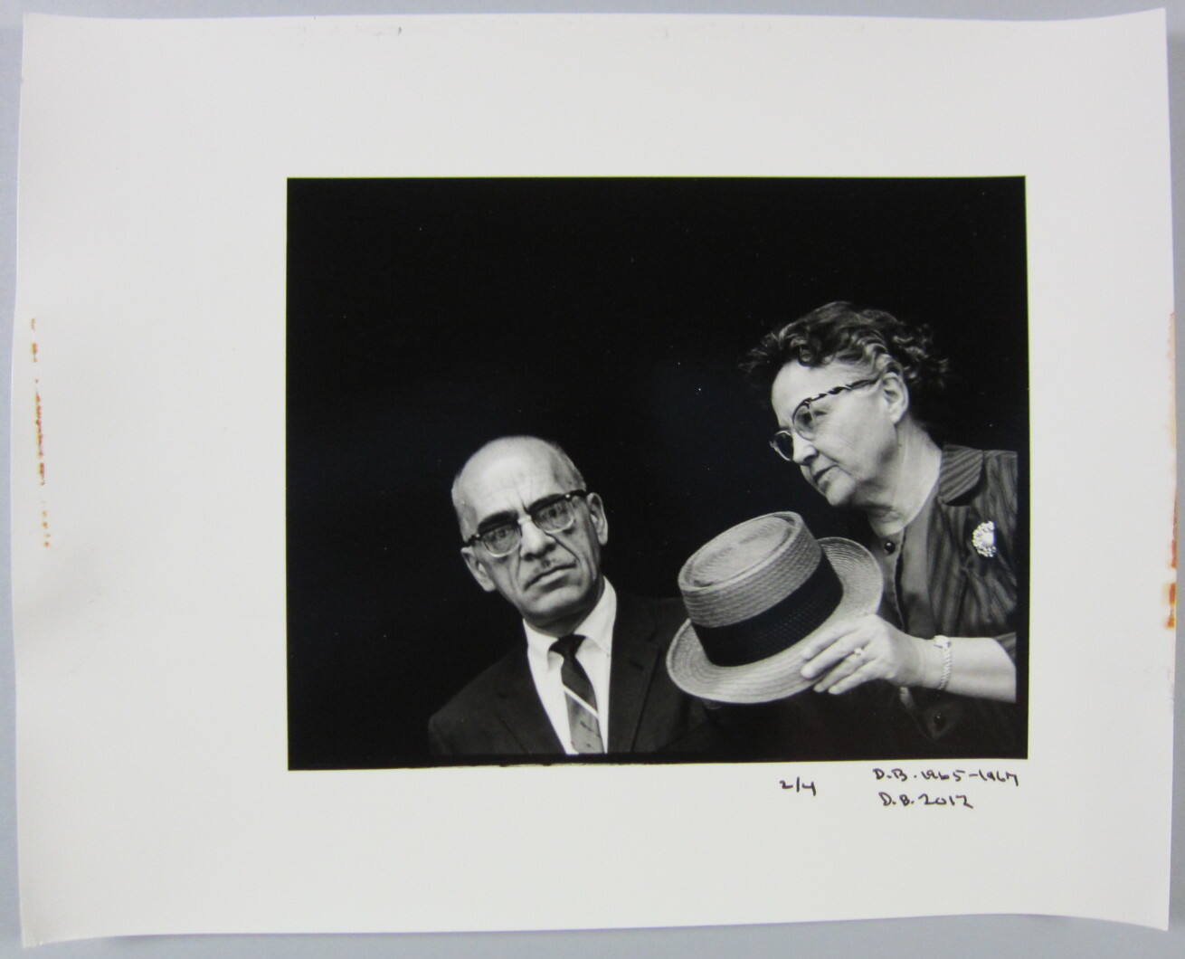 DescriptionImage of woman holding a straw hat while standing next to man wearing suit, tie, and glasses.Copyright© Donald Blumberg