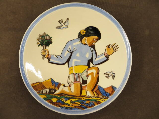 DescriptionCircular ceramic plate with transfer-printed design of young woman kneeling in a mountainous and rocky landscape, facing to her right. In her proper right hand is a bouquet of flowers; her left hand is open. Two birds fly around her. She is wearing a blue shirt with a yellow sash and a pair of vertically-striped shorts; her hair is pulled back in a low bun tied with a yellow flower. The rim encircled with a band of pale blue.Gallery LabelStories have decorated ceramics used for dining since ancient times. In 1939, the American painter and printmaker Rockwell Kent adapted woodcuts from his memoir of visits to Greenland to decorate a dinner service. Produced by Vernon Kilns of California, these vividly-colored and graphically bold designs convey the beauty of the Arctic landscape. The heroine of the book and the central figure of the service is Salamina, Kent's Inuit housekeeper (kifak). Along with her daughter, she shared Kent's small hut for the year he lived in a small Greenland fishing village.