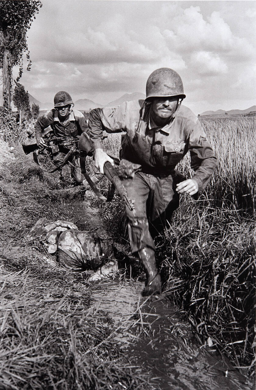 Two Marines, under enemy fire, run through a rice paddy in South Korea