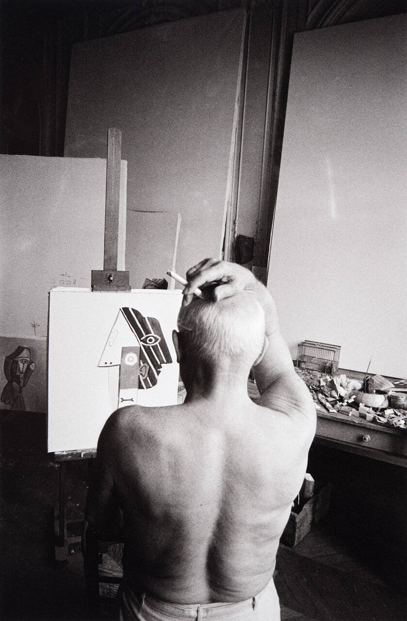 DescriptionImage of Picasso examining painting while holding cigarette above head.Copyright© Harry Ransom Center, The University of Texas at Austin